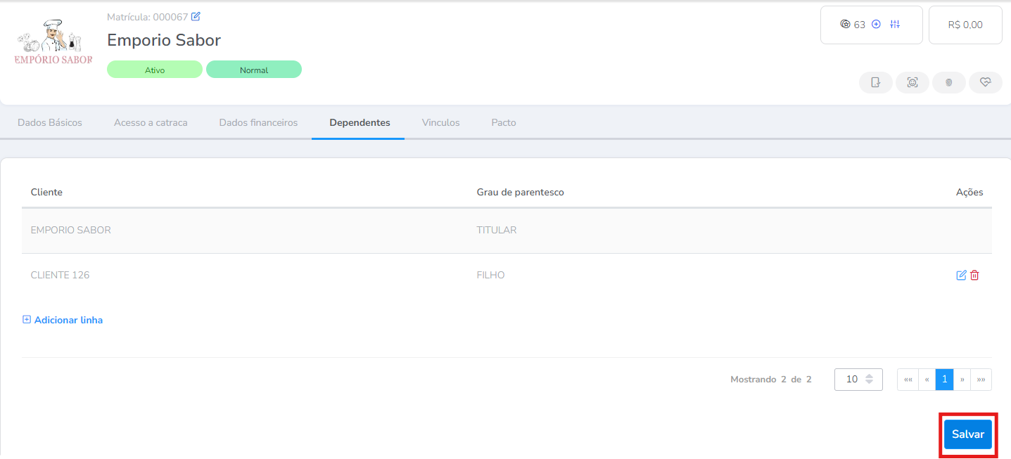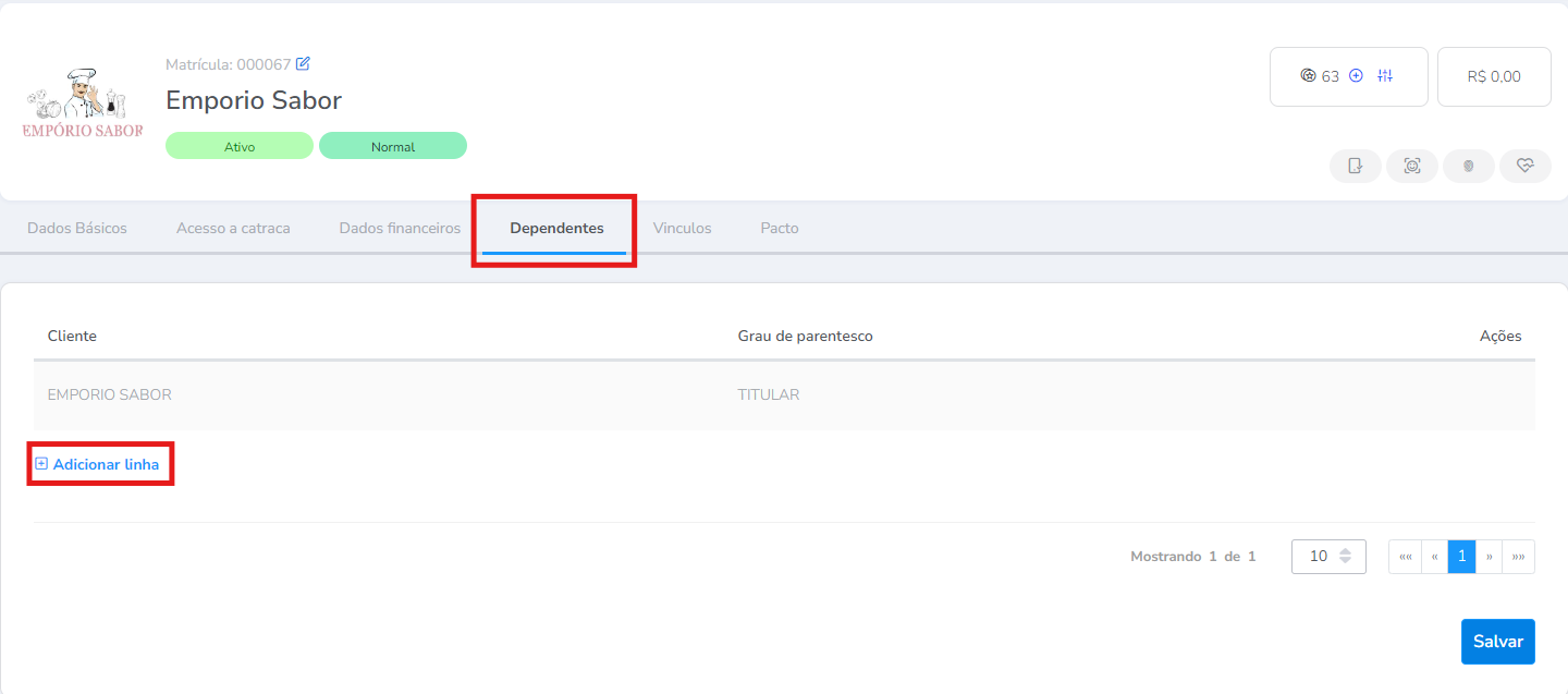 1. Clique na guia “Dependentes” para realizar a vinculação do aluno à empresa. Em seguida, selecione “Adicionar linha” para efetivar o vínculo;