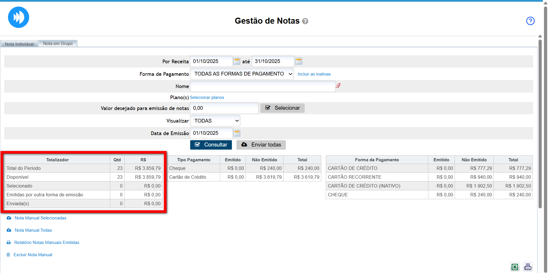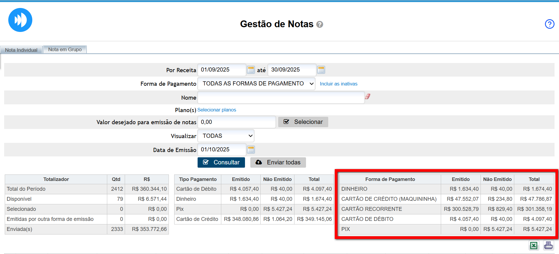 - Enviadas por outra forma de pagamento: exibe as notas que já foram enviadas em um formato diferente de emissão;