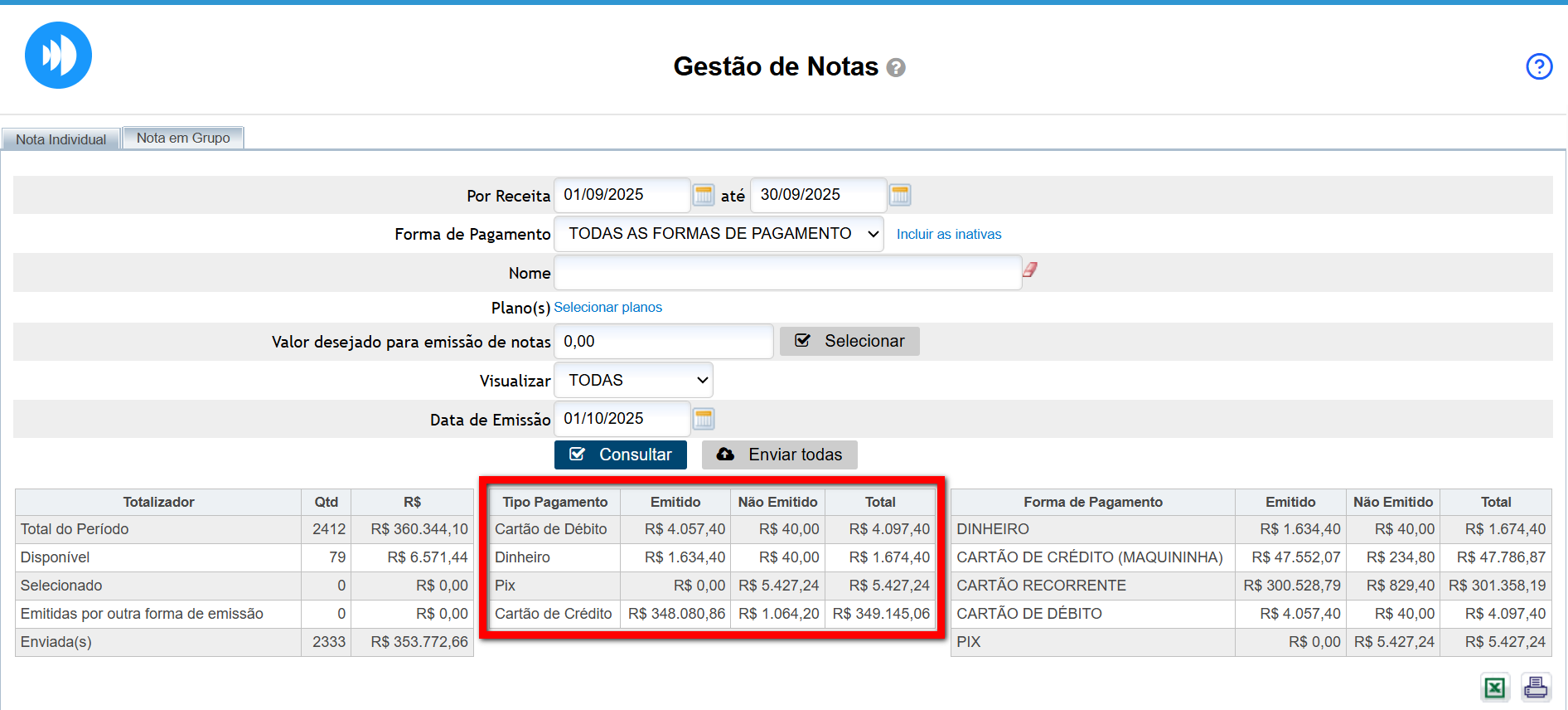 2. No campo “Tipo pagamento” é exibido o total do período, mas separado por cada tipo de pagamento. Assim, os valores das notas ficam organizados conforme o tipo de pagamento em que foram recebidos;