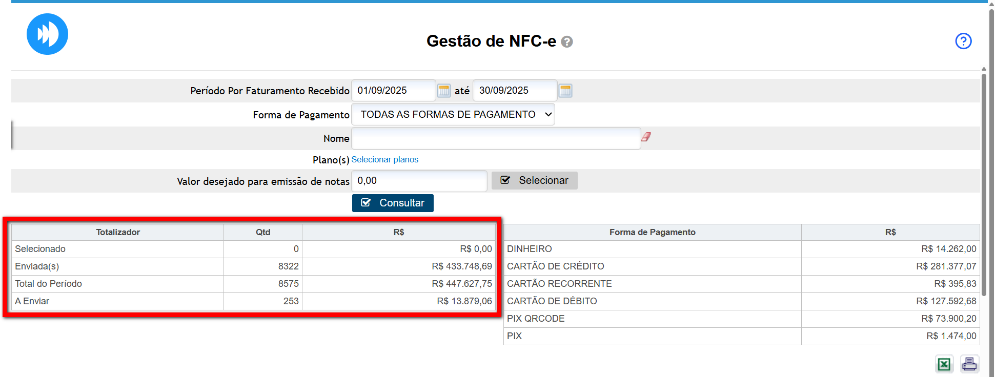 1. No campo “Totalizador” é apresentada a quantidade de NFC-e PARA SER EVIADA dentro do período selecionado;
