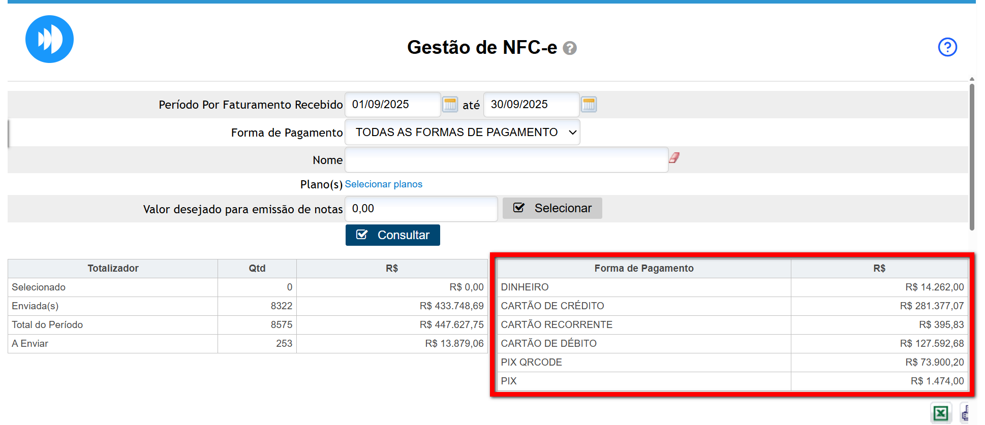 3. No campo “Forma de pagamento” é exibido o total do período, mas separado por cada forma de pagamento. Assim, os valores das notas ficam organizados conforme a forma de pagamento em que foram recebidos.