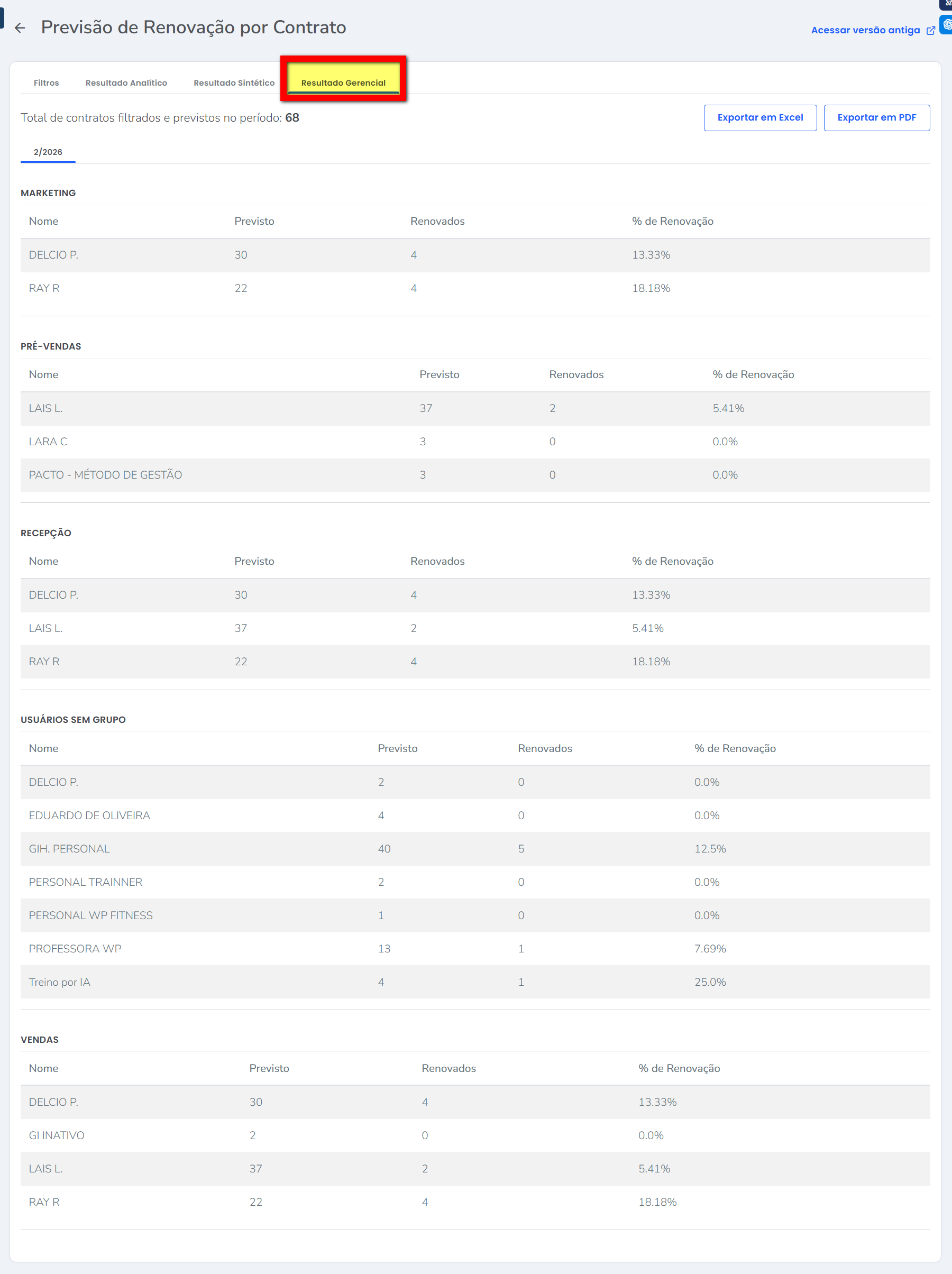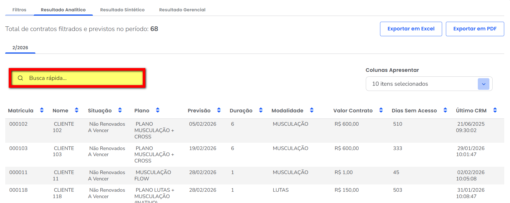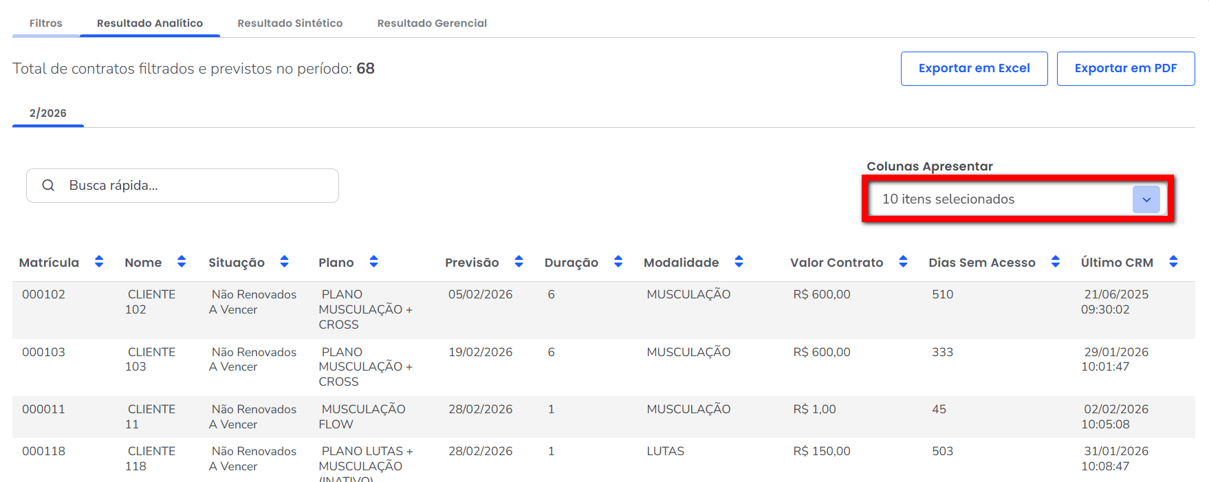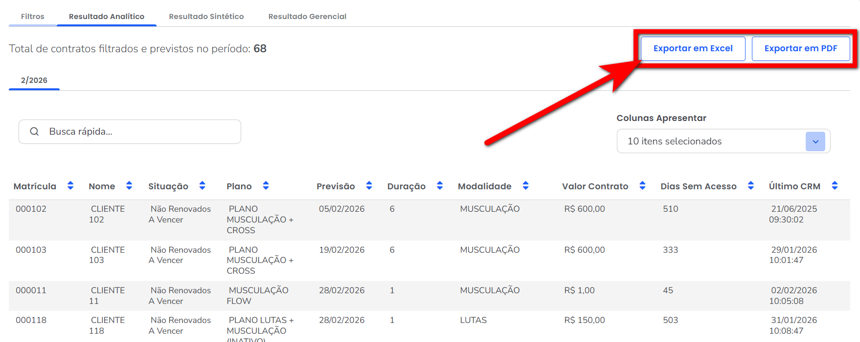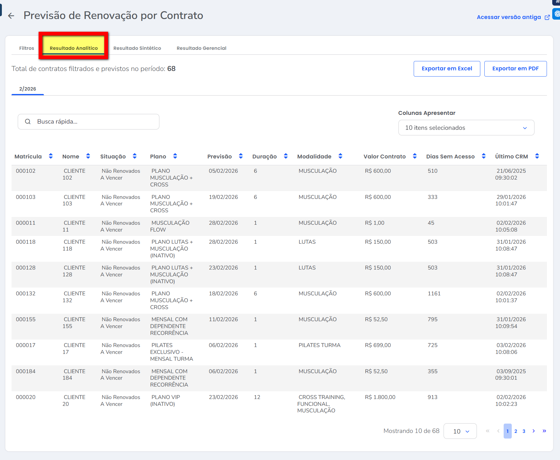 4.1. Na guia “Resultado Analítico”, o sistema mostra em forma de listagem quais são os alunos que estão na previsão de renovação de contrato, de acordo com os filtros selecionados;