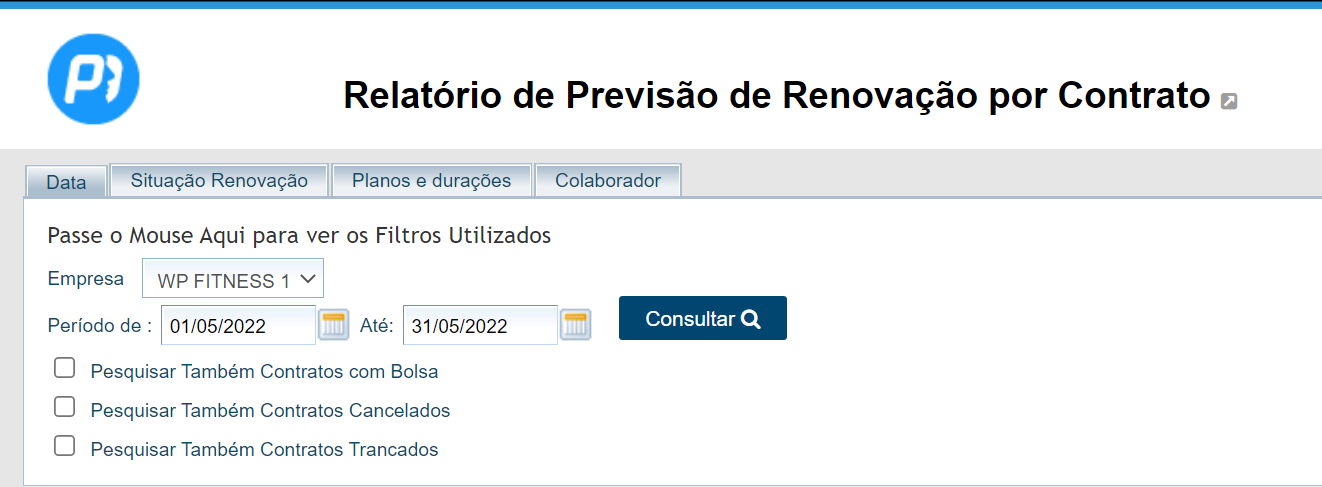 O relatório Previsão de Renovação por Contrato permite que o gestor possa visualizar todos os clientes que possuem o contrato vencendo dentro do período desejado.