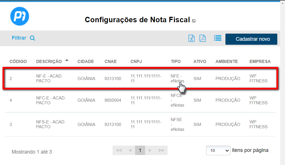 2. Selecione a configuração da nota fiscal que será configurada;