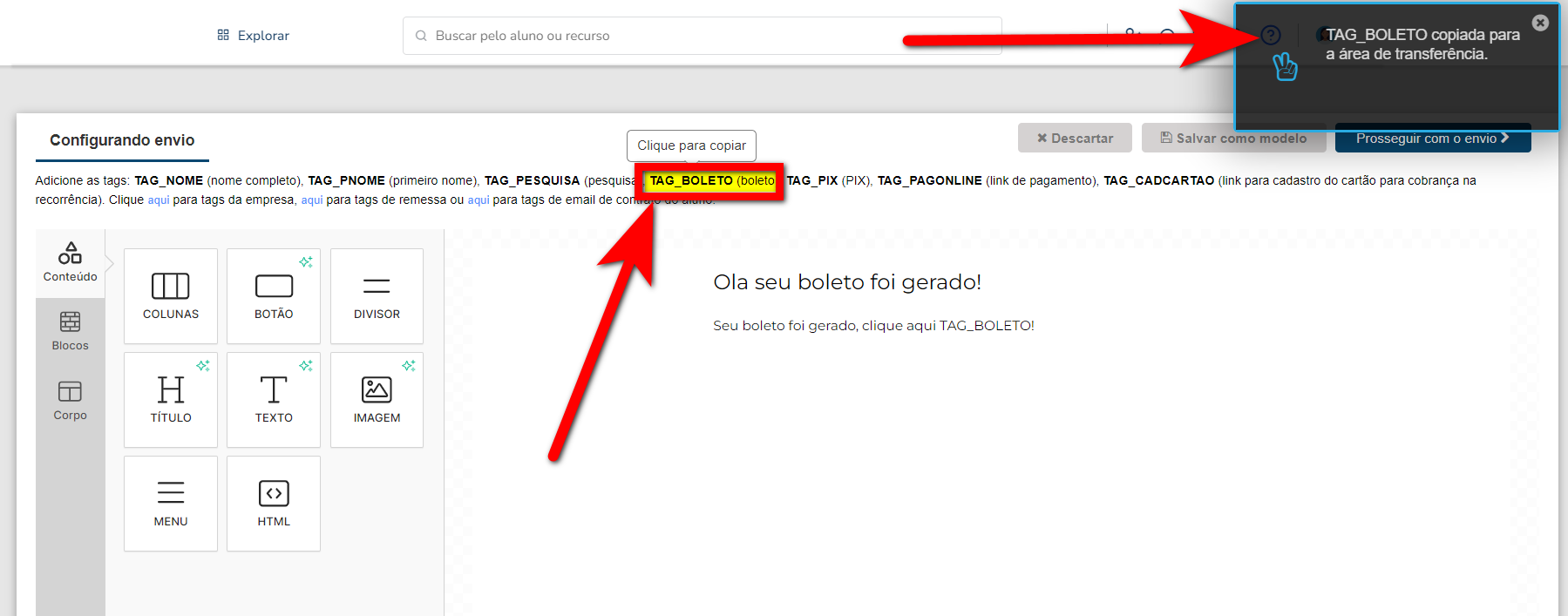 3. Na tela de cadastro, clique em “Tag Boleto“ localizado na parte superior, até ser apresentada a mensagem “TAG_BOLETO copiada para área de transferência“, com isso o sistema no envio do e-mail já adota um modelo de mensagem padrão;