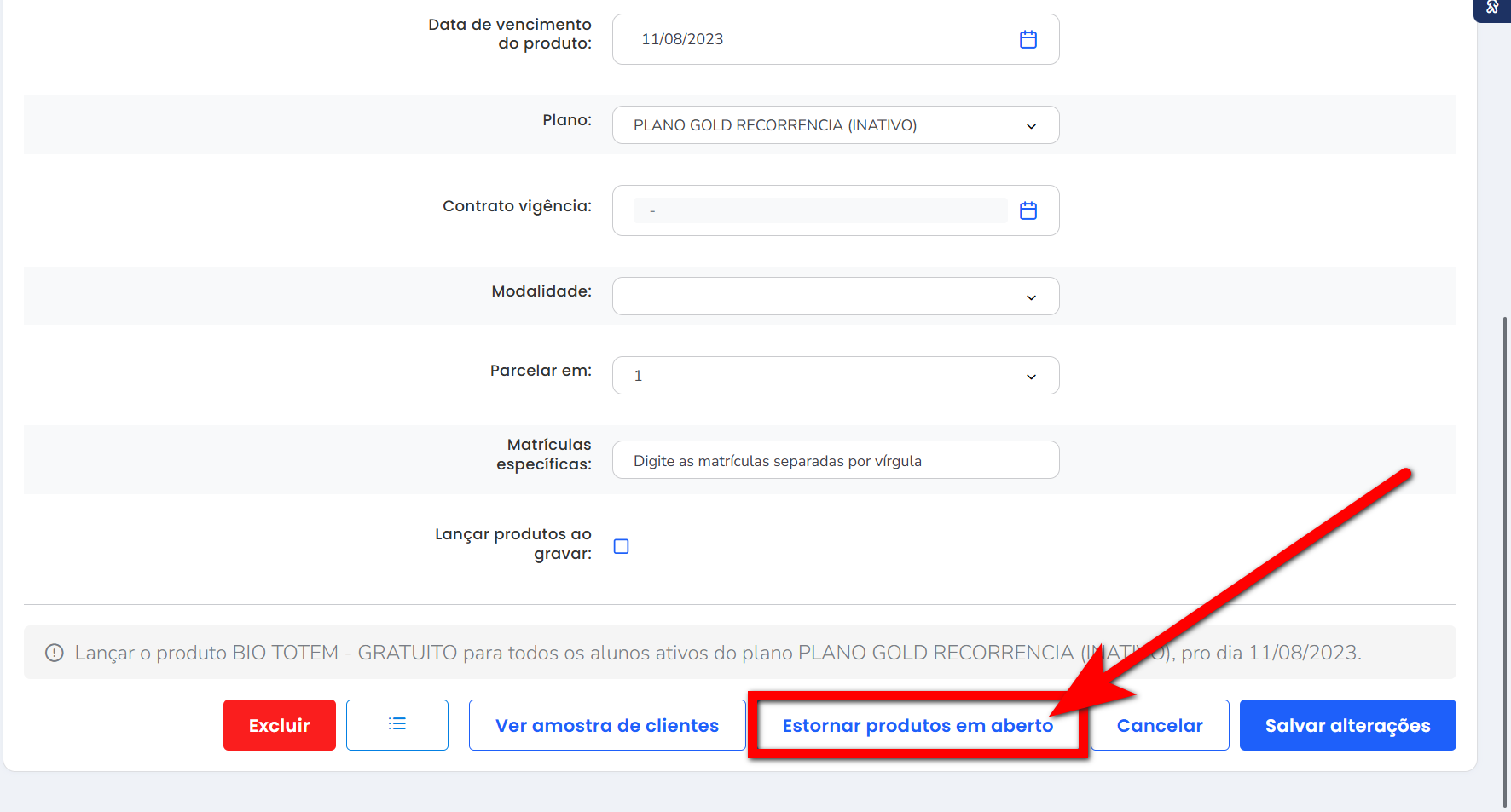 3. Clique no botão “Estornar produtos em aberto“;