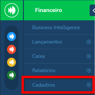 1.1. Outra forma de acessar é através do menu lateral esquerdo do módulo Financeiro, clicando em “Cadastros”;