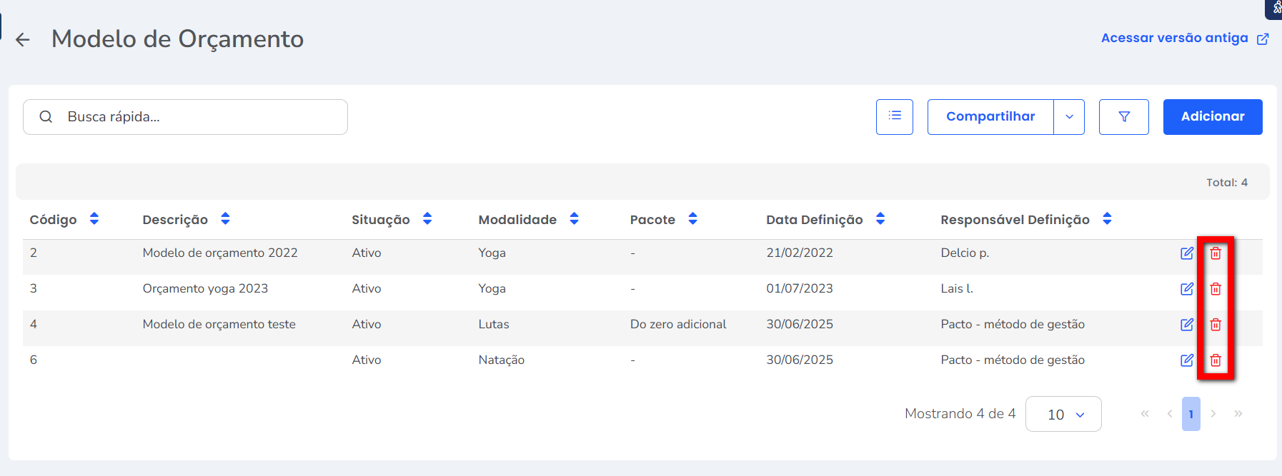 2. O sistema irá listar os modelos de orçamento já cadastrados. Para excluir, basta clicar no ícone de lixeira;