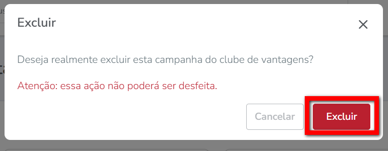 3. Na tela será apresentado um aviso que pergunta se realmente deseja excluir a campanha. Clique em “Excluir” para concluir.