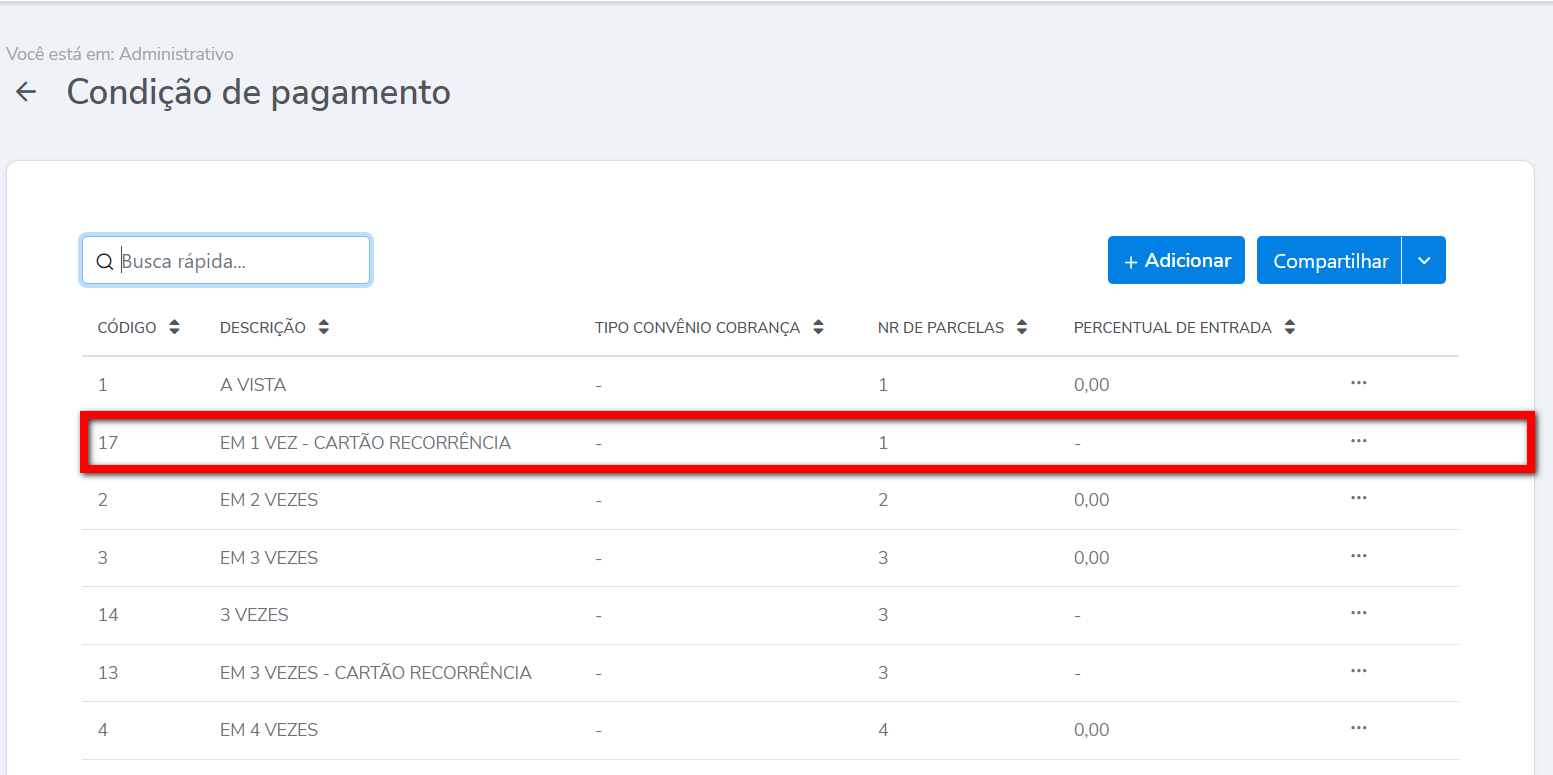 2. Em seguida, será apresentada a tela com as condições de pagamentos configuradas anteriormente. Selecione a condição de pagamento que possua na descrição “Cartão Recorrência”;