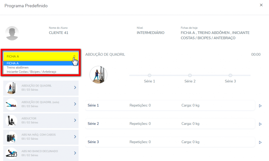 4.3. Para visualizar e alterar as fichas do programa apresentado, clique na opção da ficha atual e selecione a desejada;