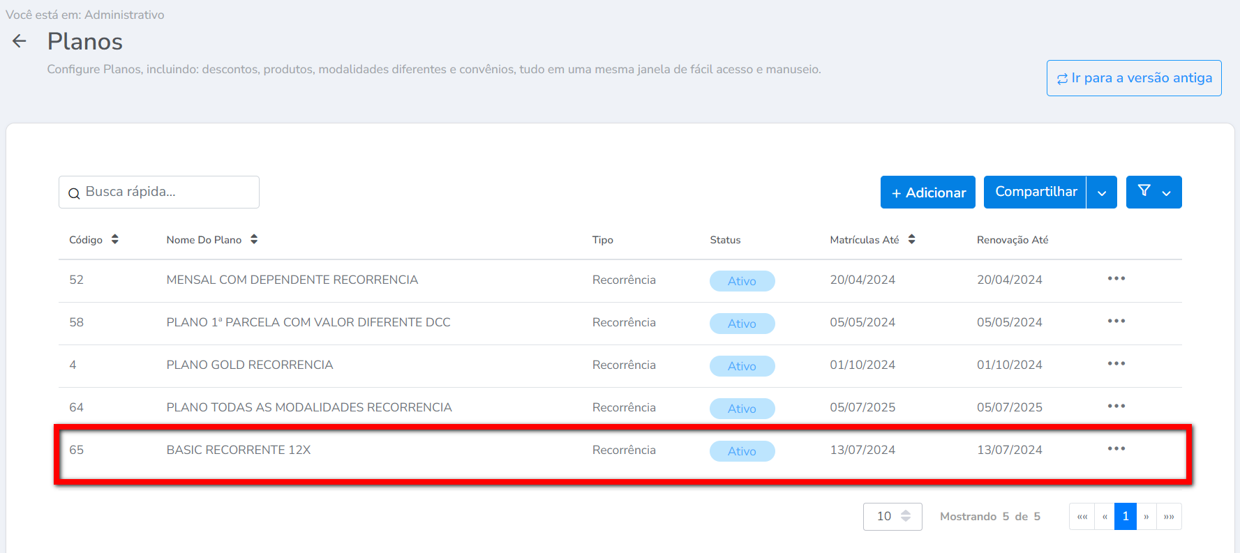 Observação: utilize o filtro com ícone para marcar somente os planos do tipo recorrência.