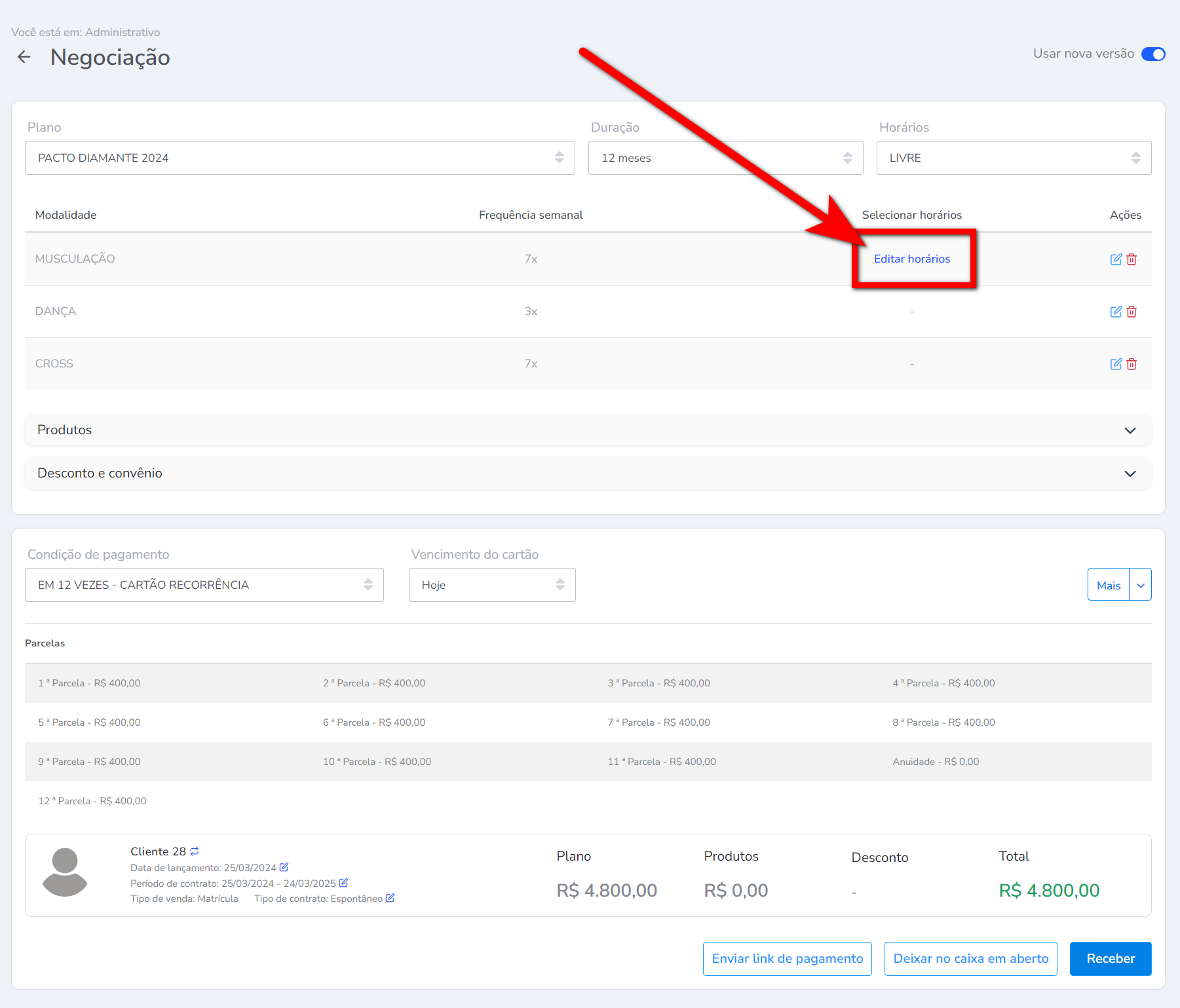Atenção: a fixação pela tela de negociação faz com que o aluno seja fixado nas aulas escolhidas até o final do contrato.