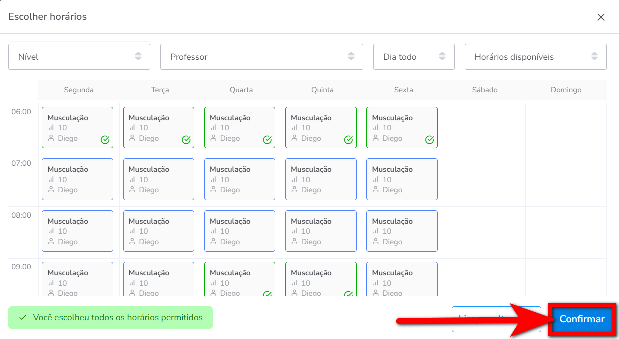 2. Localize e clique sobre os horários que deseja agendar e fixar o aluno. Após clique em “Confirmar“;