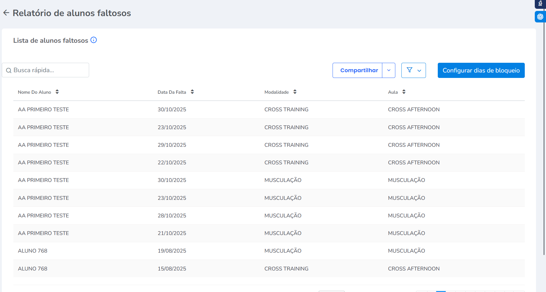 - Aula: nesta coluna, é exibido o nome da aula que o aluno faltou.