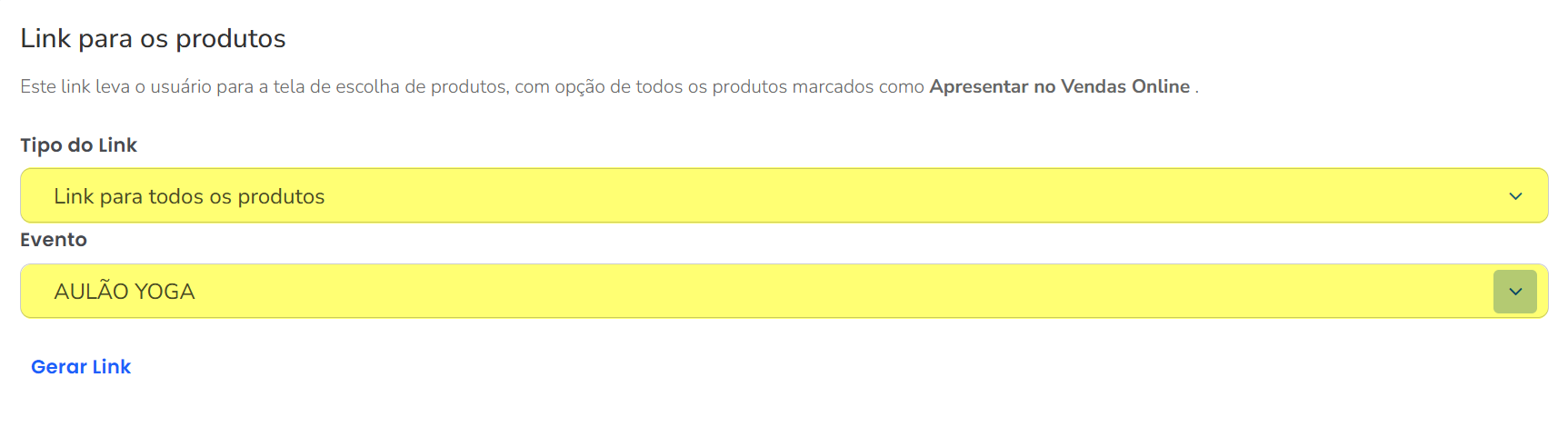 3.2. Para produtos, basta escolher o tipo de link e o evento associado;