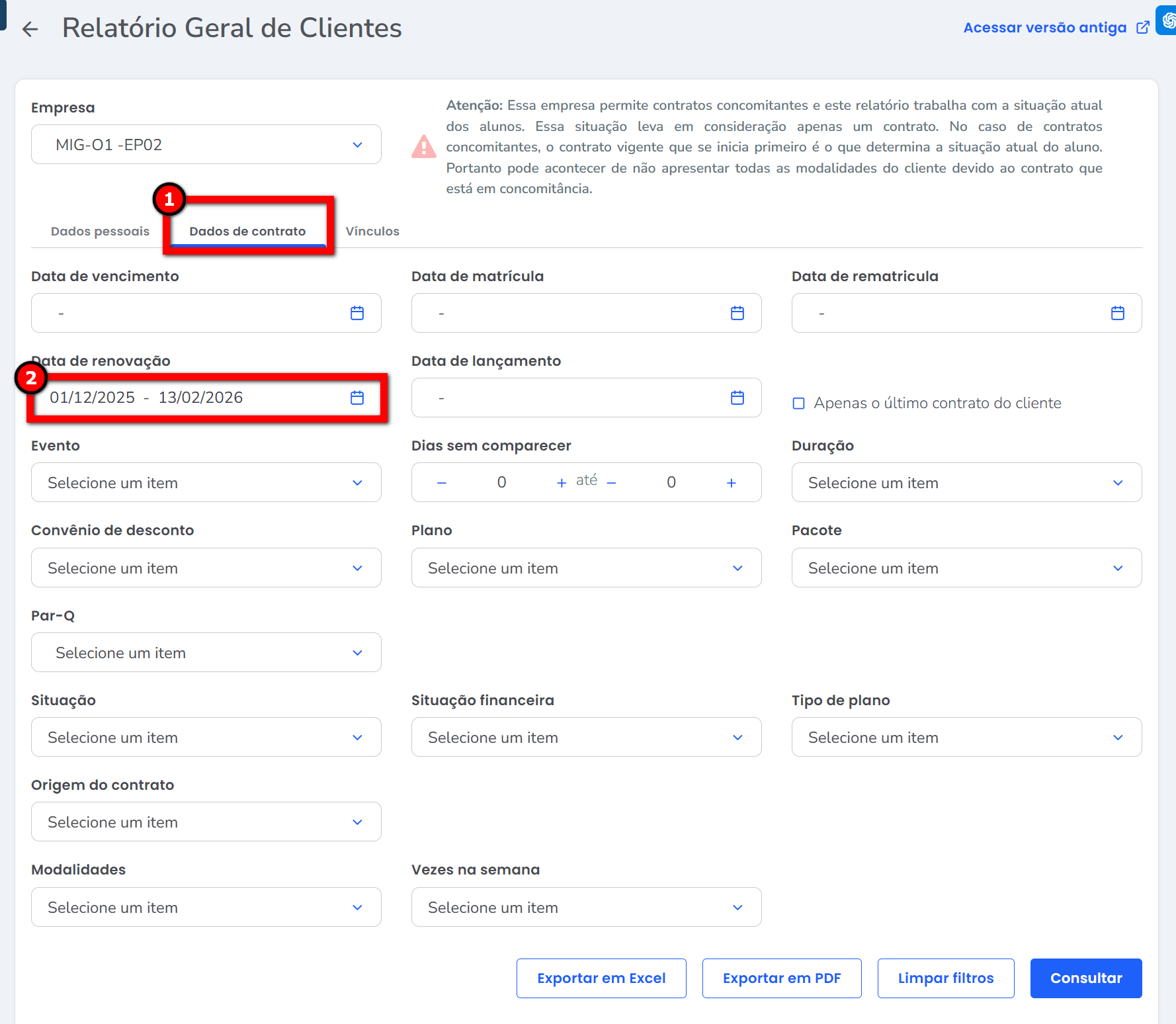 3. Para gerar o relatório desejado, na guia “Dados de contrato”, informe no campo “Data de Renovação” o período que deseja consultar;