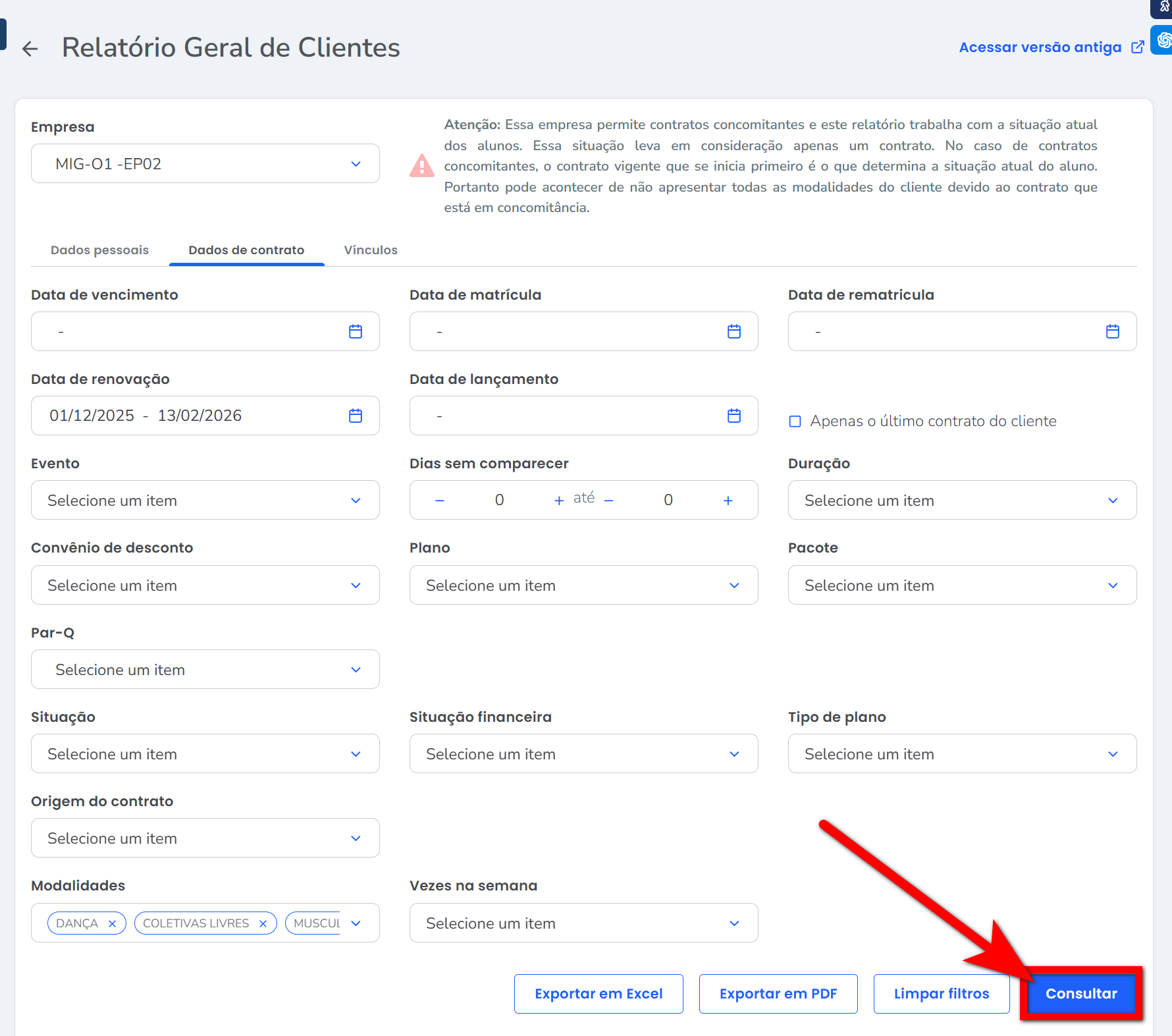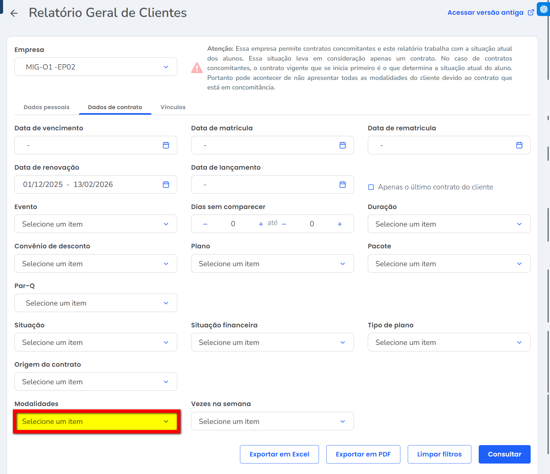 O sistema possui uma ferramenta chamada Geral de Clientes, que permite gerar diversos relatórios com base nos alunos que se enquadram nos filtros aplicados.