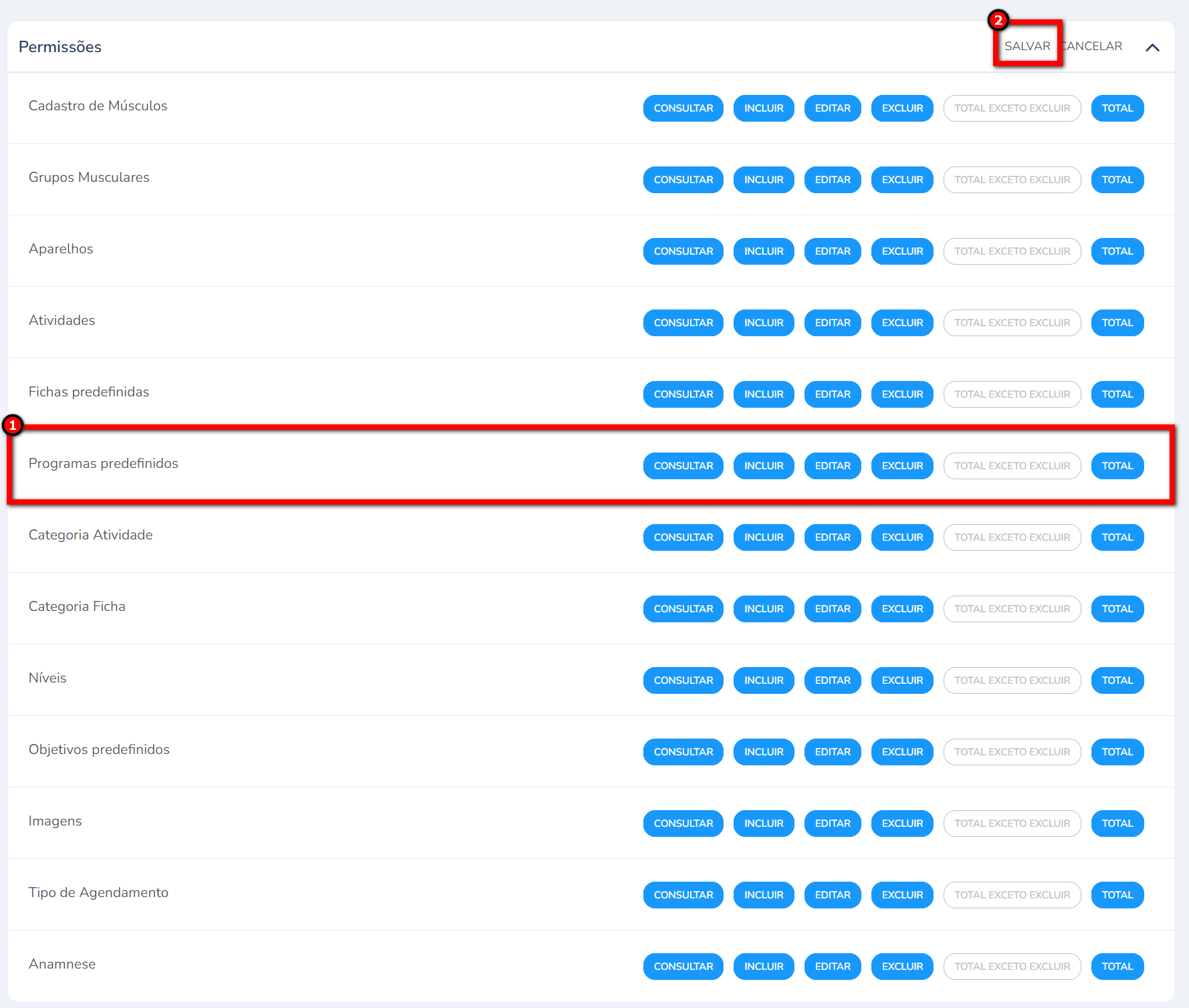 - Total sem excluir: pode consultar, incluir e editar um Programa predefinido já cadastrado;