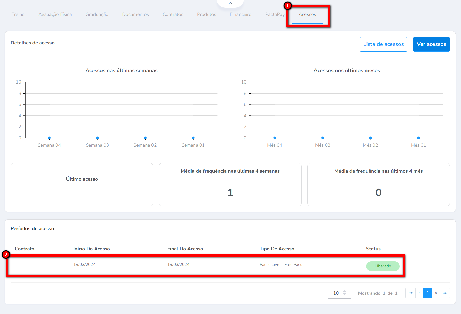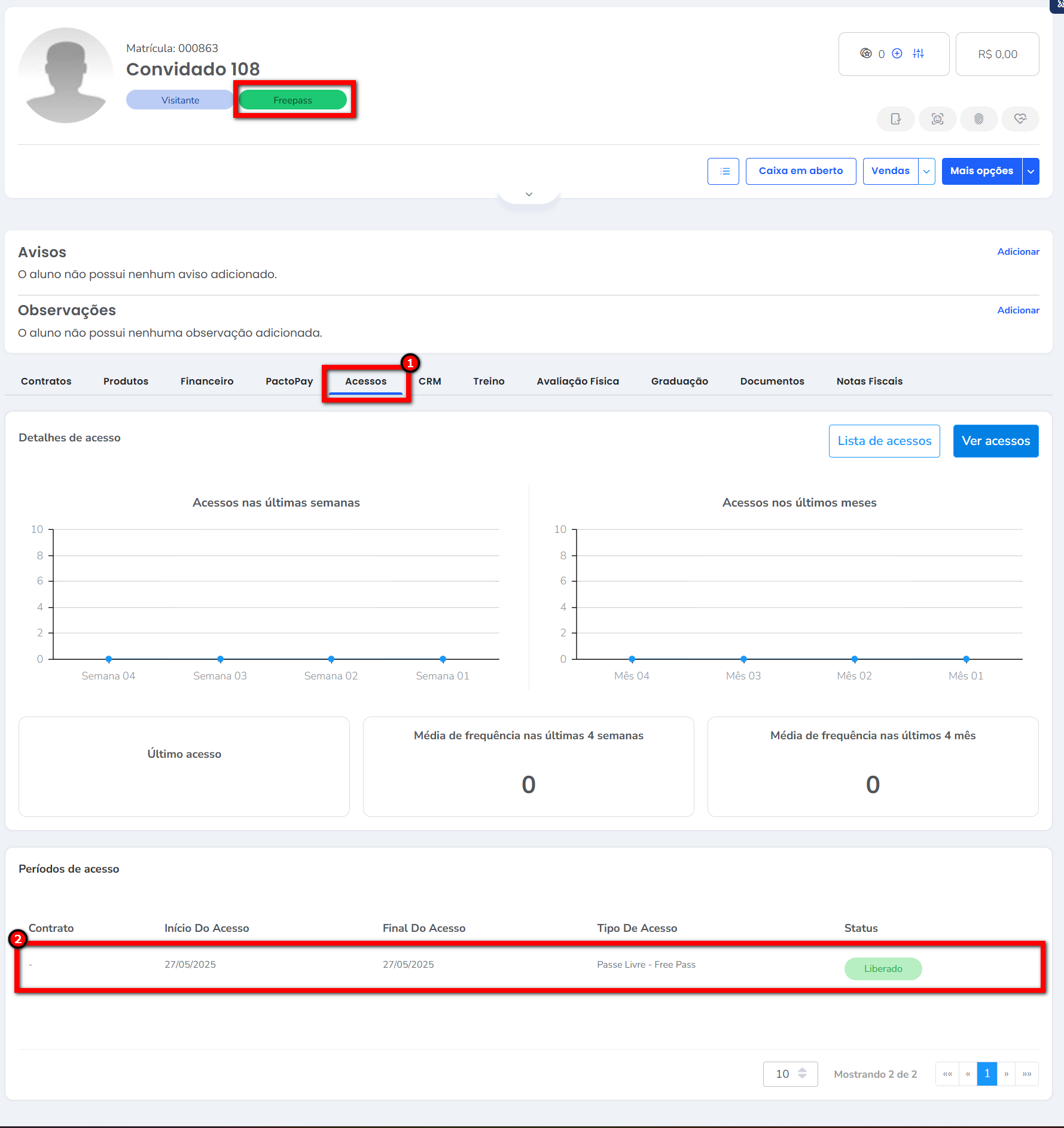 8. O cliente convidado terá um passe livre de 1 dia lançado em seu cadastro. Para visualizar no cadastro do visitante clique na guia “Acessos” em seguida no bloco “Períodos de acesso” na coluna “Tipo de acesso” consegue visualizar o produto lançado para liberação de acesso.