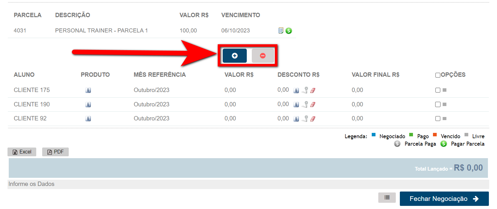 8. Será direcionado ao “Caixa em aberto” para receber do personal o pagamento mensal por aluno.