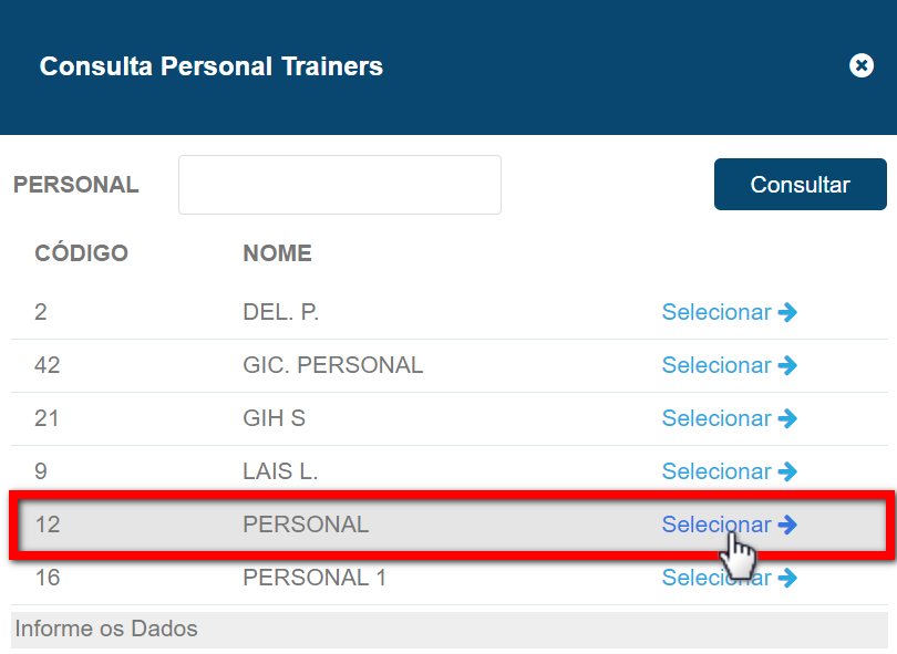 2. No campo Personal, clique no ícone  para selecionar o personal. Depois de selecioná-lo, clique em “Consultar“;