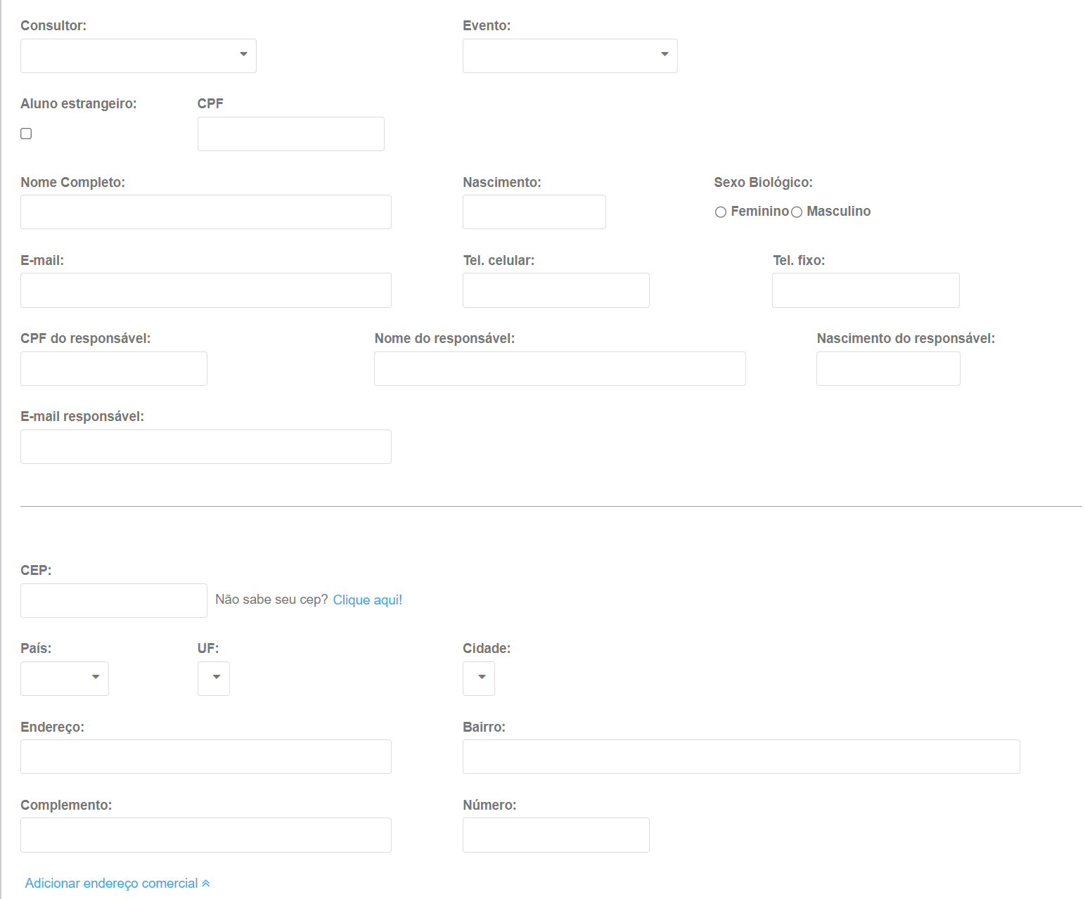 2. Ao carregar a página, são exibidos alguns campos similares ao cadastro de aluno, siga o passo a passo para realizar a operação;
