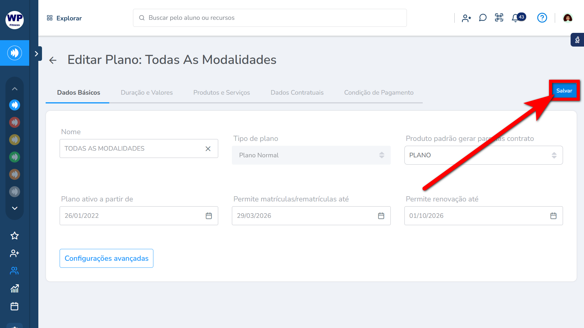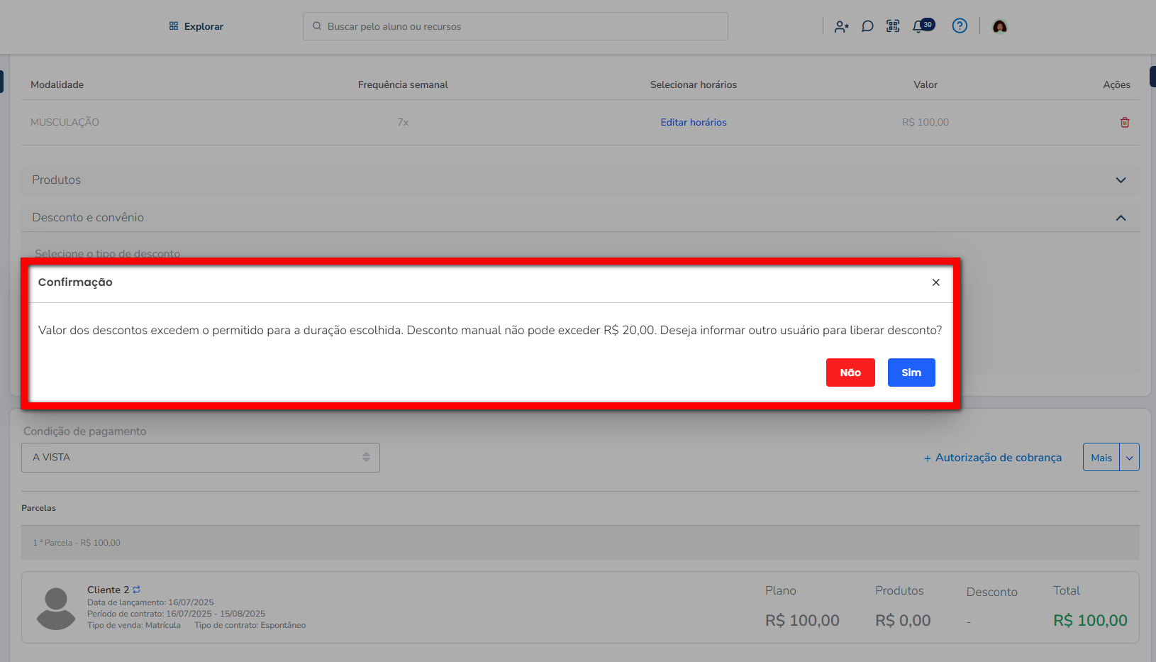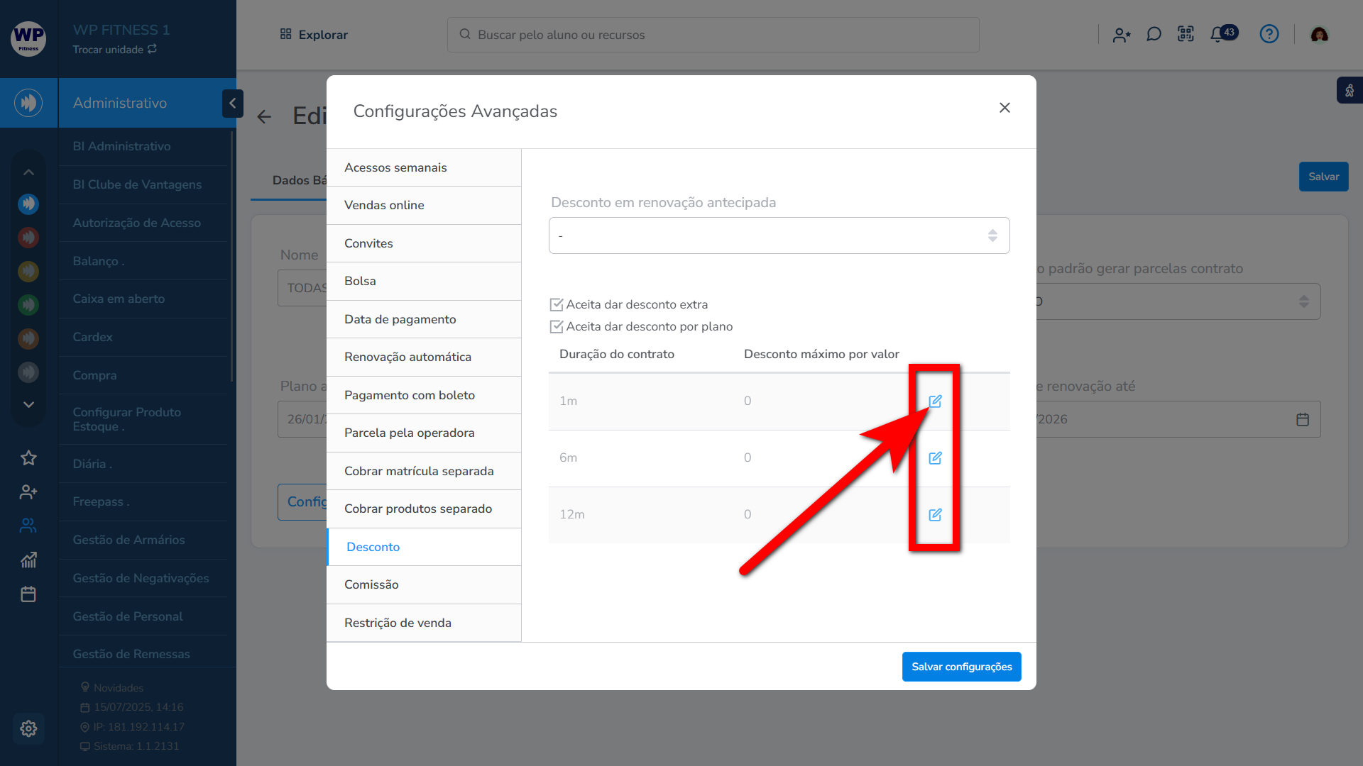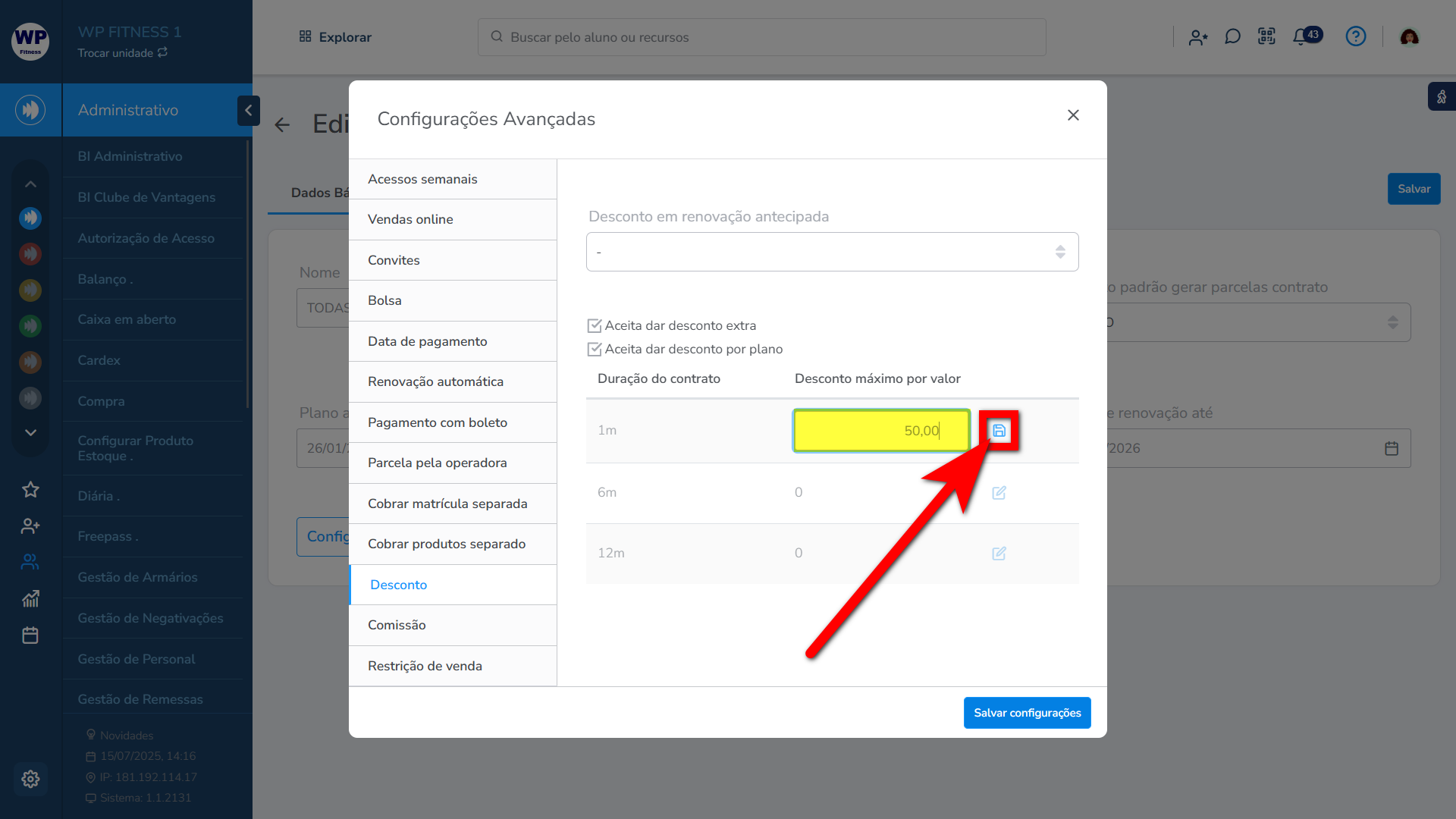 Pra tornar esse processo mais seguro e organizado, o sistema agora permite configurar limites de desconto específicos para planos do tipo normal ou avançado. Ou seja, você pode definir um valor máximo de desconto para cada duração de plano oferecida na unidade, direto no cadastro do plano.