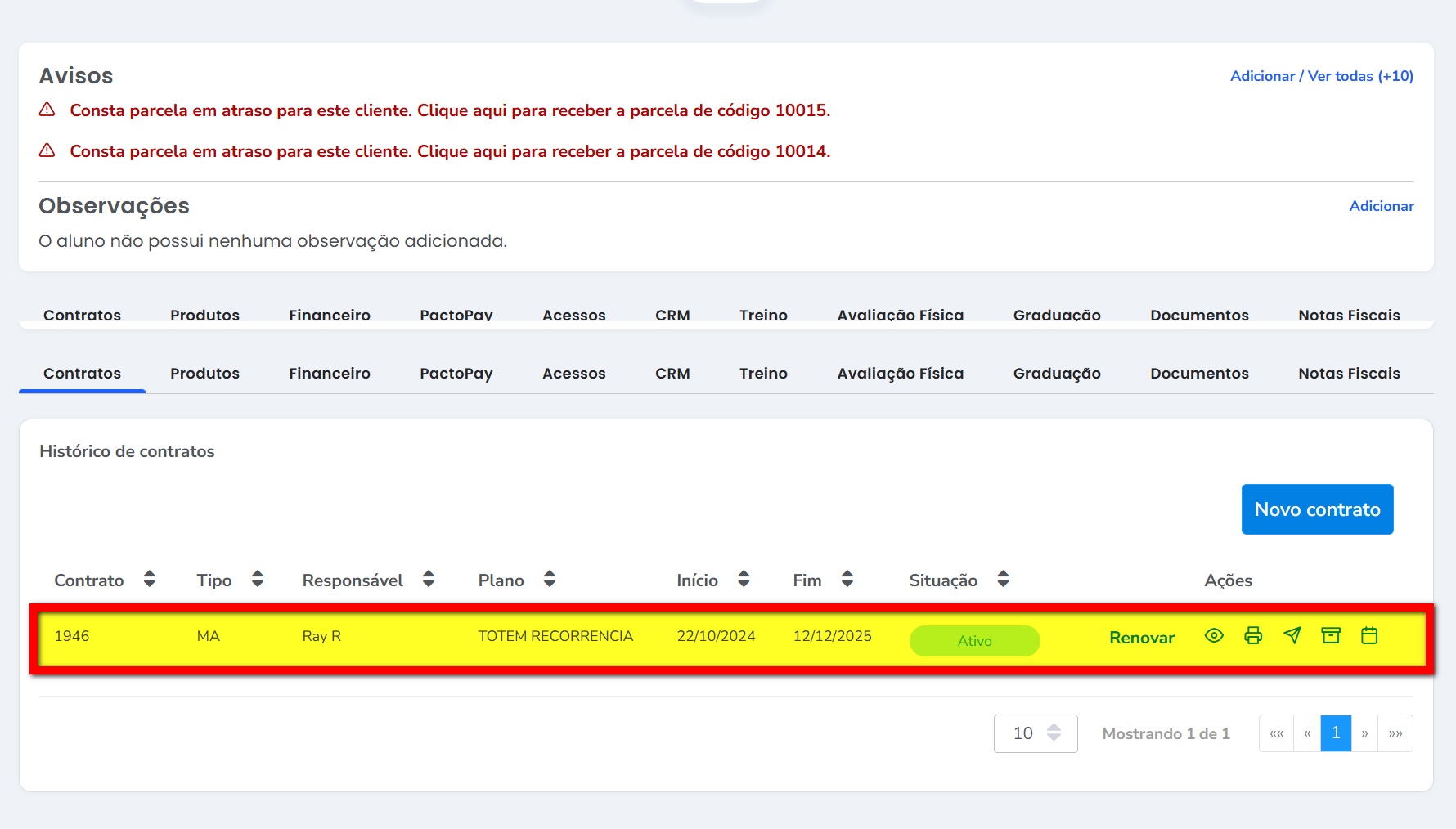 1. A primeira forma é acessando o perfil do aluno e, na guia “Contratos”, localizar o contrato que deseja alterar a data de cobrança e clicar sobre ele;