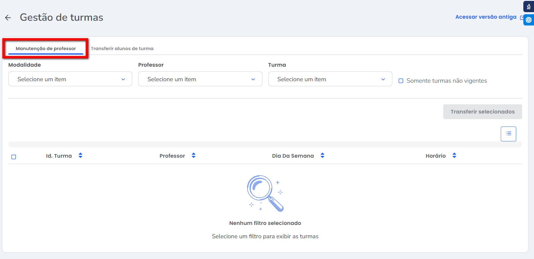2. Na guia “Manutenção de Professor”, o sistema exibirá filtros para facilitar a troca de professor. Selecione os filtros desejados;