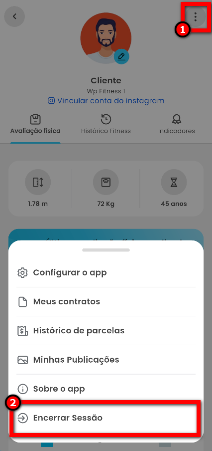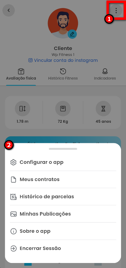 No App Treino, o aluno pode acessar diversos recursos do próprio perfil de forma simples e rápida.