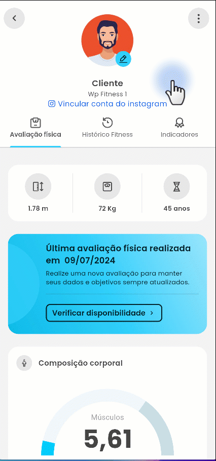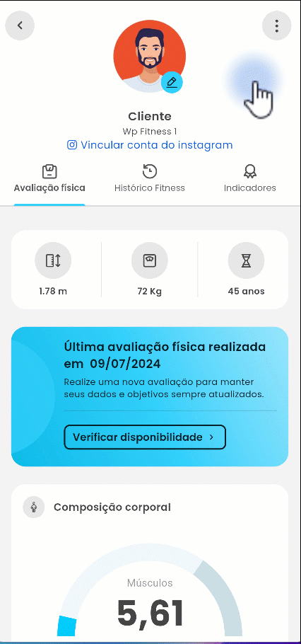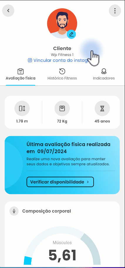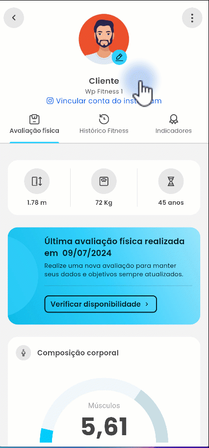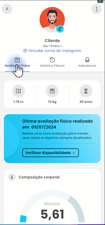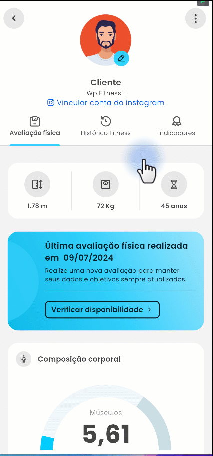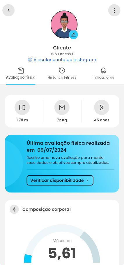 Neste card, o aluno encontra as informações da última avaliação física. Ele consegue acompanhar a evolução e ver dados como altura, peso, idade, IMC, composição corporal, peso ideal, medidas de perimetria e dobras cutâneas.