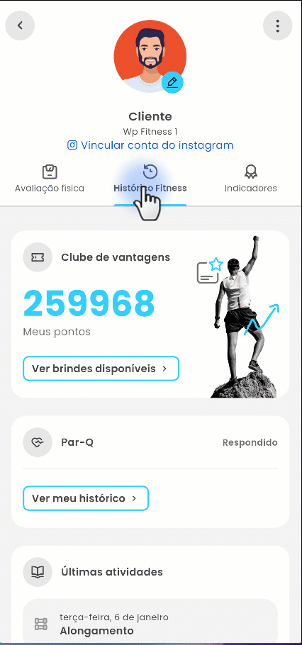 Ele consegue visualizar e interagir com informações importantes, como dados cadastrais, planos e contratos ativos, histórico de treinos, pontuação e muito mais.