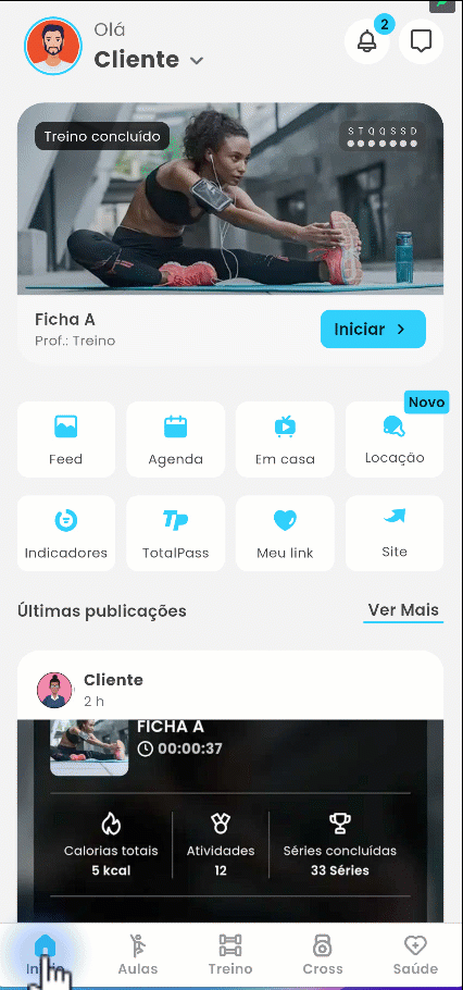 - Início Na tela inicial, reunimos as principais informações para facilitar o dia a dia. O aluno acessa o treino do dia, o feed, a agenda de serviços, o treino em casa, a locação de armários e seus indicadores de frequência. Também encontra o acesso ao TotalPass, links pessoais e da academia. Além disso, ele visualiza as últimas publicações, o resumo e a agenda de aulas, a avaliação do professor e os convites.