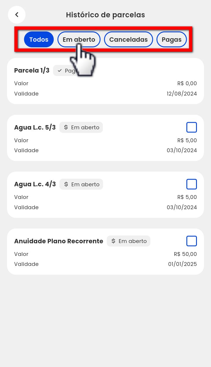 4.2. Utilize os filtros para visualizar apenas as parcelas “Em aberto“;