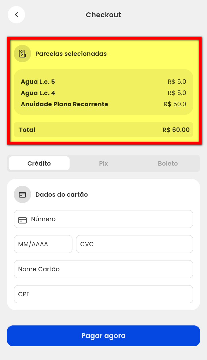 6. Na tela de checkout, serão apresentadas algumas informações, como a descrição e o valor das parcelas selecionadas ou vencidas. O sistema também exibe o valor total do pagamento que será realizado;