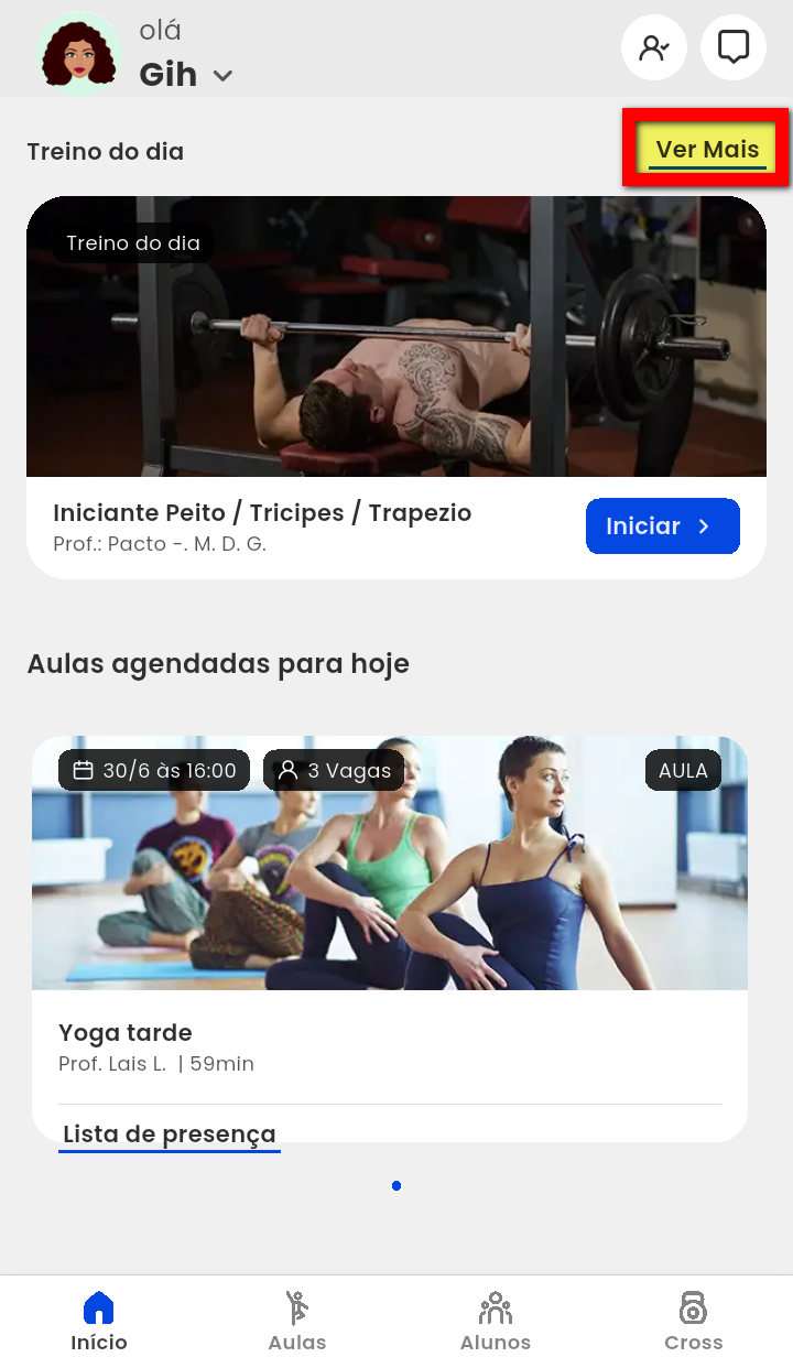 1.1. Clicando em “Ver mais”, é possível visualizar as demais fichas do seu programa de treino e, caso necessário, selecioná-las.