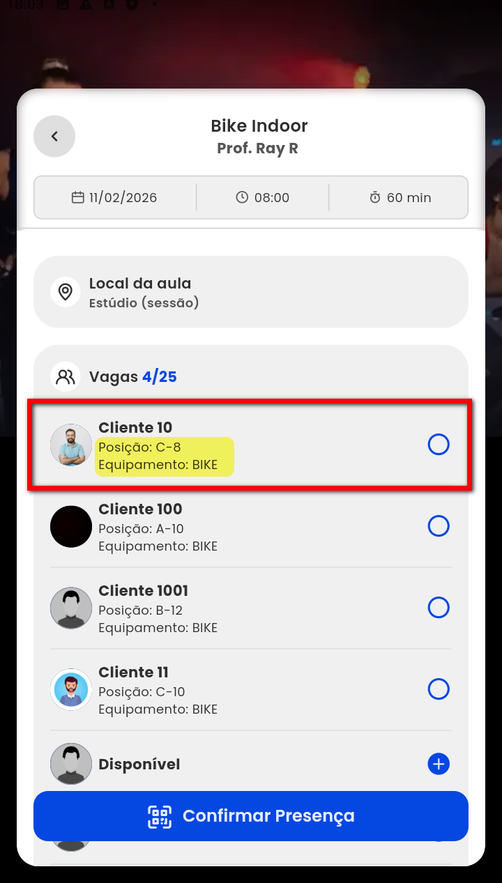 Exemplo: uma academia oferece aulas de Bike Indoor e disponibiliza o mapa de equipamentos para o aluno poder selecionar uma bicicleta específica, num local mais perto do professor e mais climatizado. Este aluno faz o check-in no app Treino, o mapa de equipamentos aparece após o check-in e se ele escolher o aparelho A-1 (primeira fileira, primeira posição), fará a aula exatamente no lugar que deseja.