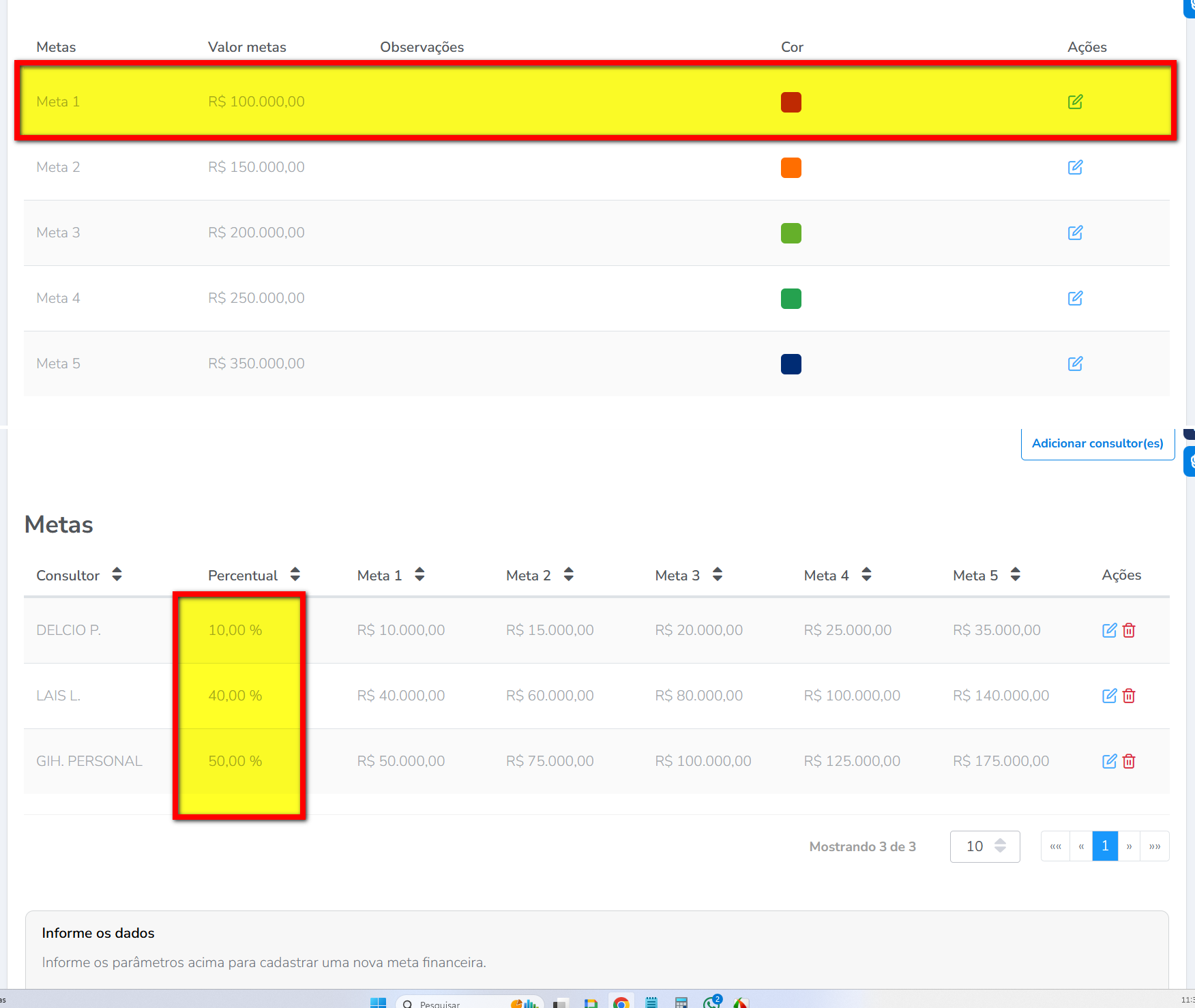 No exemplo acima, definimos que a meta total é de R$100.000 e configuramos a porcentagem individual de cada colaborador na meta, que indica o quanto do total da meta precisa ser atingido para que ele tenha direito à comissão: