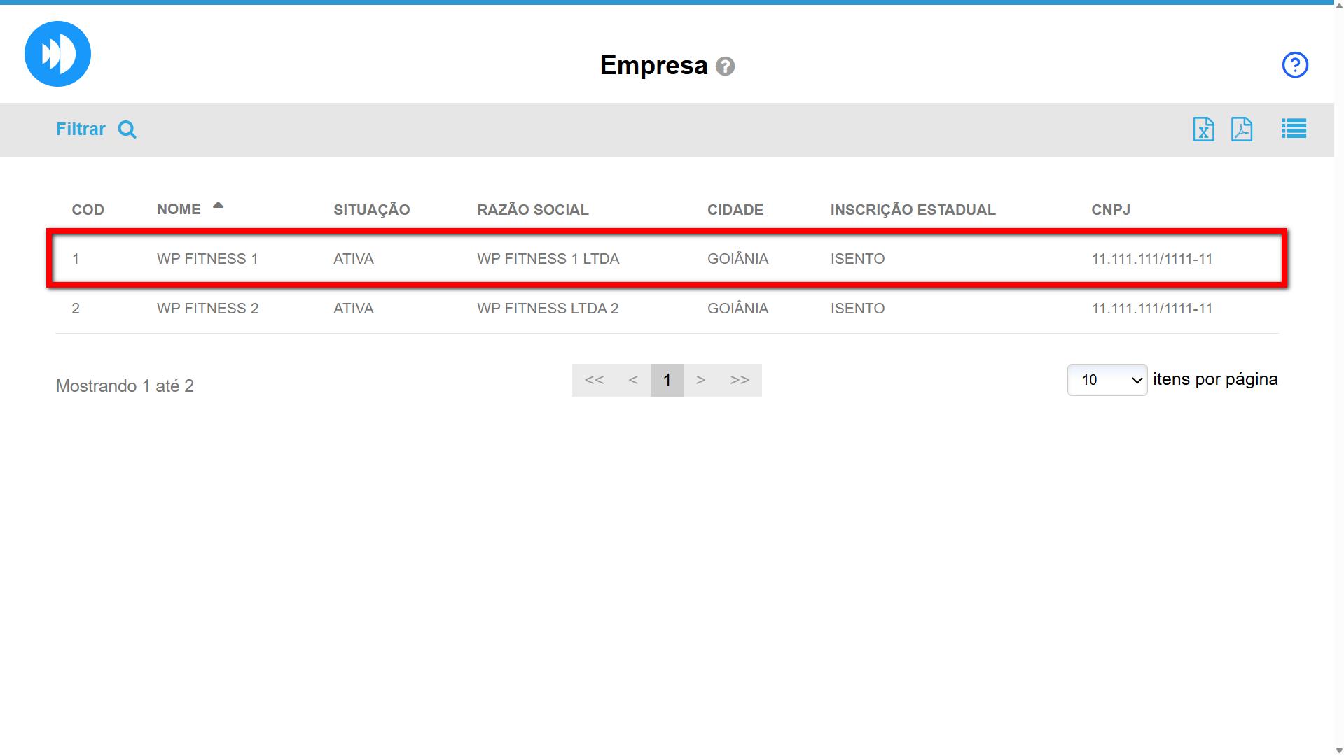 2. Selecione o cadastro da empresa que deseja configurar;