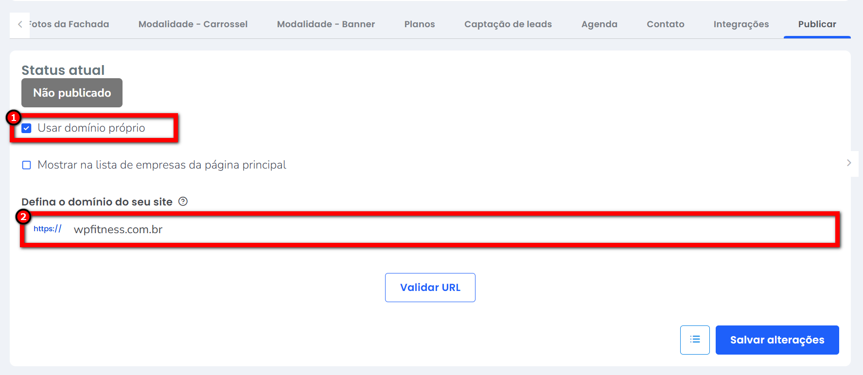 4.1. Após adicionar o domínio, clique em “Validar URL” para que o sistema realize a verificação do endereço informado;