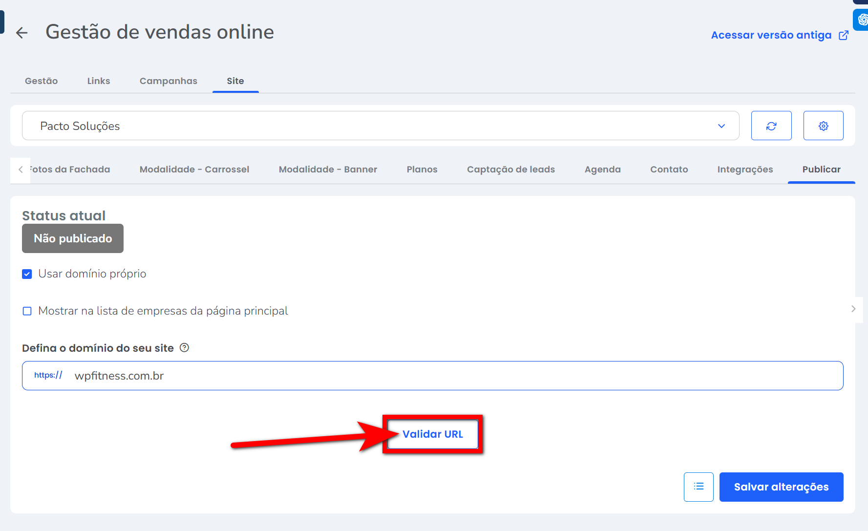 4.1. Após adicionar o domínio, clique em “Validar URL” para que o sistema realize a verificação do endereço informado;