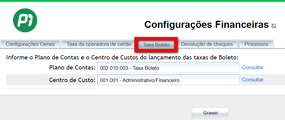 3. Nesta tela, você deve definir para qual “Plano de Contas” e “Centro de Custo” o sistema deve direcionar os valores relacionados a taxa de boleto. Para isso, clique no botão “Consultar” na frente de cada um dos campos, para definir as configurações necessárias;