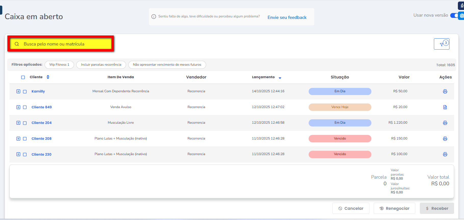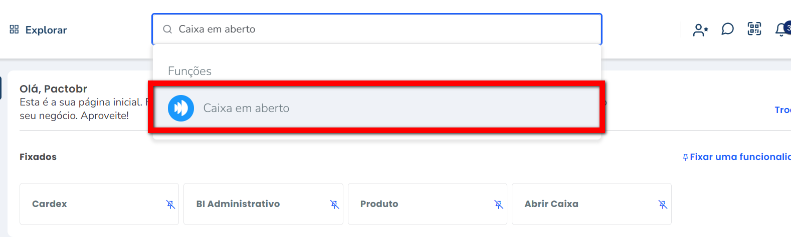 1. Na lupa de busca, pesquise por “Caixa em aberto“;