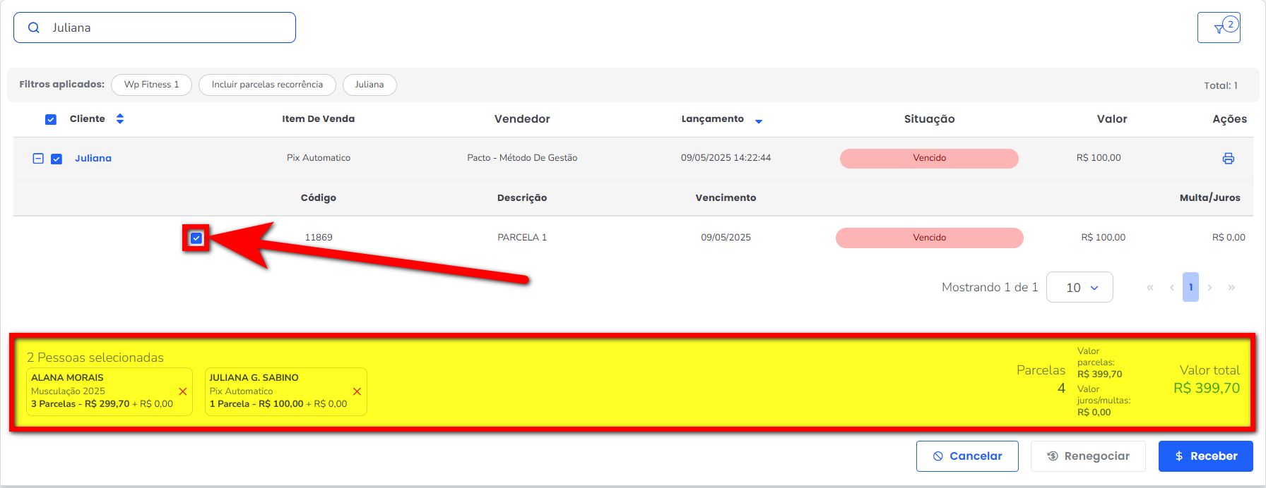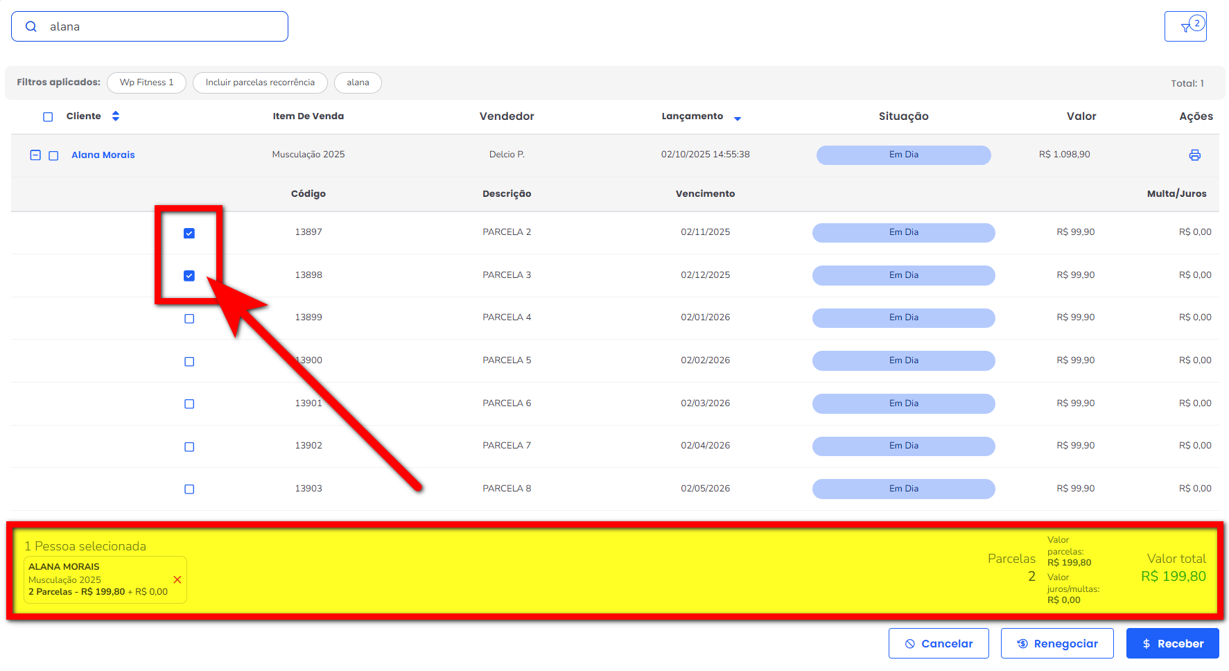 6. Selecione a(s) parcela(s) desse aluno e confirme se elas aparecem no campo “Parcelas”, junto com as parcelas selecionadas do primeiro aluno;