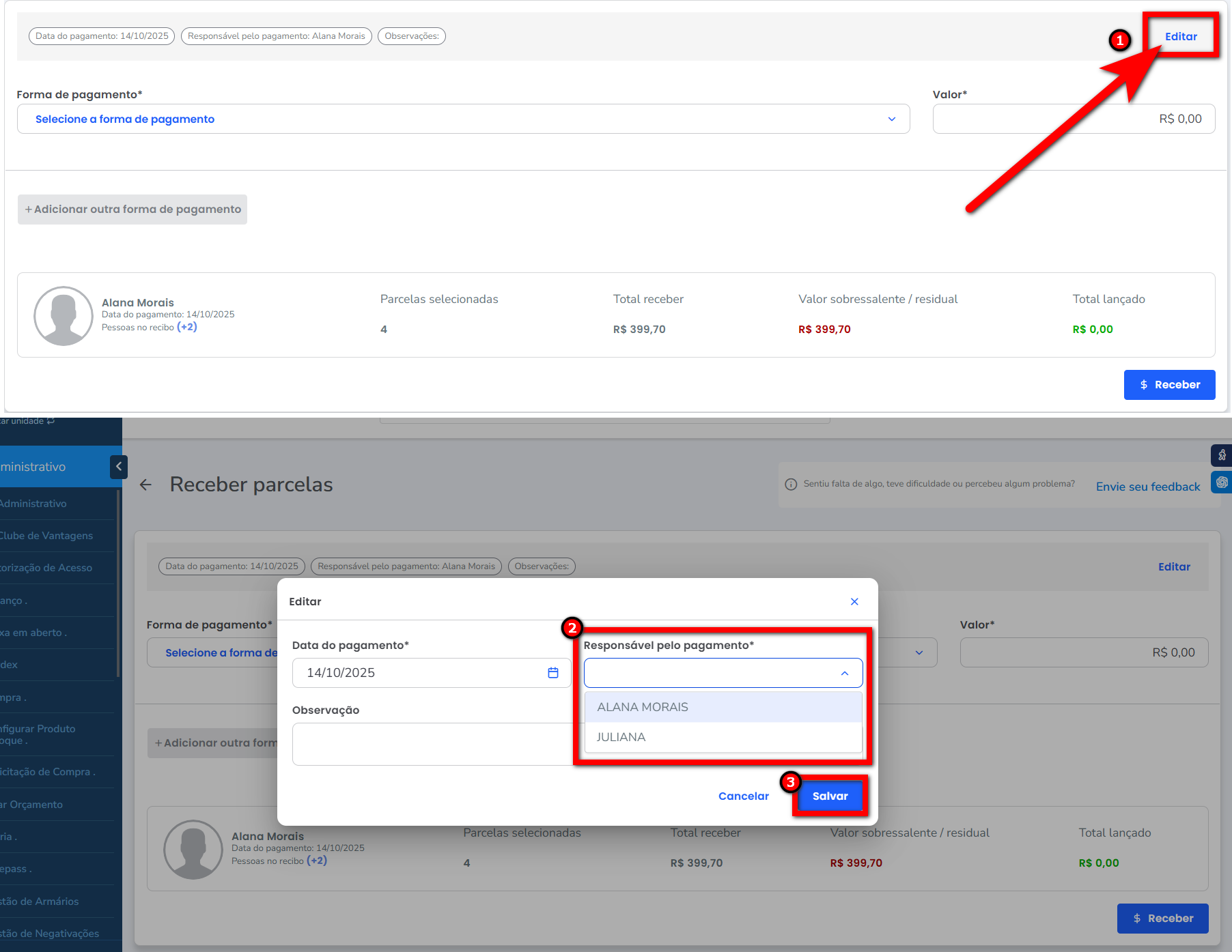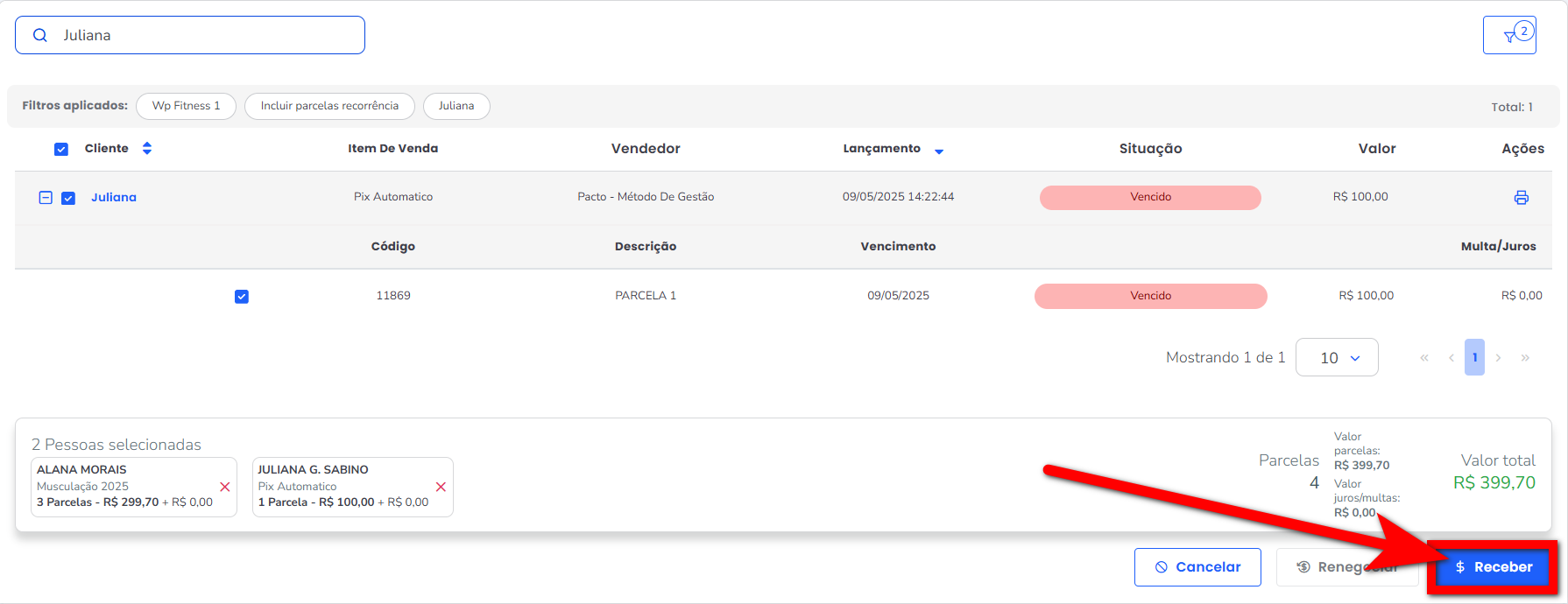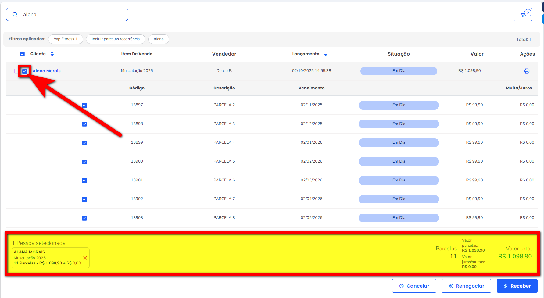 No Caixa em Aberto, é possível selecionar as parcelas de ambos os alunos e recebê-las juntas, utilizando a forma de pagamento desejada.