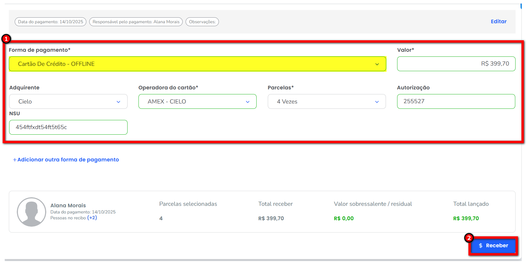 Observação: também é possível receber pelos demais meios de pagamento, como Dinheiro, Pix, entre outros. O procedimento permanece o mesmo; apenas a forma de pagamento é alterada conforme a escolha no momento do recebimento.