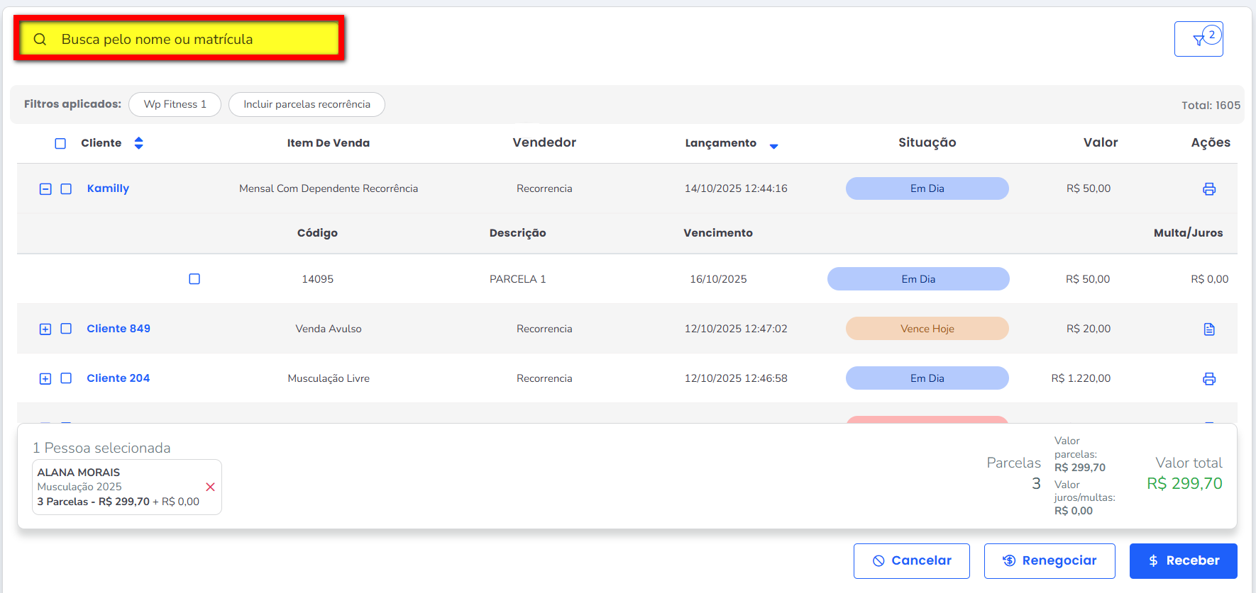 2. Localize o primeiro aluno informando a matrícula ou o nome do cliente no campo de busca;