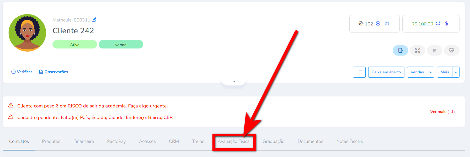 1. No perfil do aluno localize e clique na guia “Avaliação Física“;