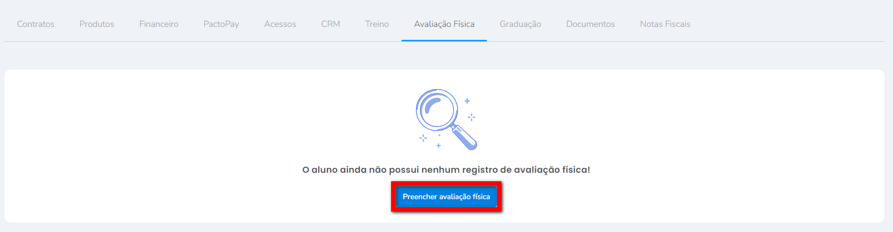 2. Caso o aluno não tenha nenhuma avaliação lançada anteriormente será apresentado o botão “Preencher avaliação física“. Clique sobre ele para iniciar a avaliação;